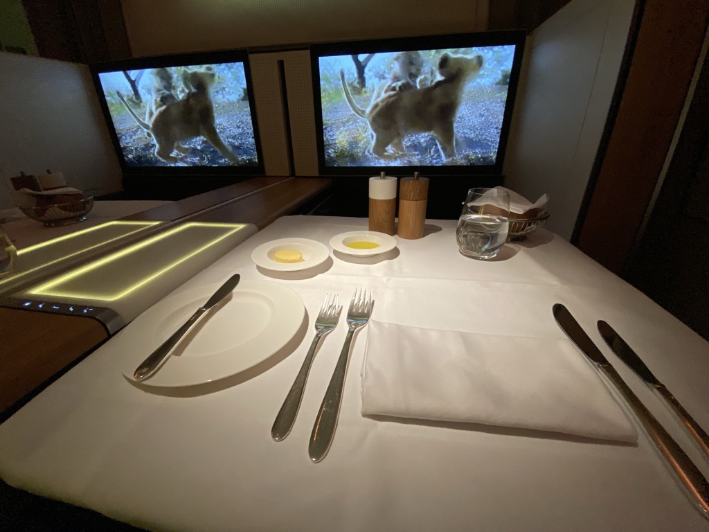 Bei unserem Flug sollte das leibliche Wohl auch nicht zu kurz kommen. Noch vor dem Start wurde uns ein Glas Champagner und ein Gruß aus der Küche angeboten. Wenige Minuten später wurden wir zum Menü beraten und durften unsere Bestellung aufgeben.