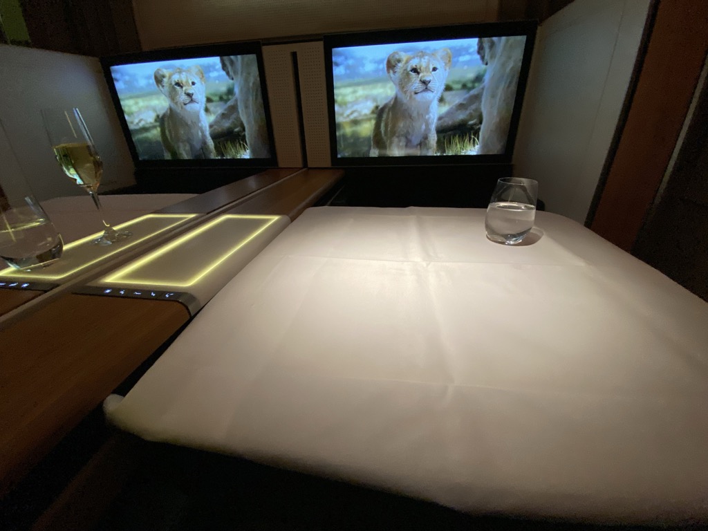 Jeder der acht Sitze ist hierbei eine „halbe“ Suite. Man kann sich extrem gut vom Rest der Kabine abschirmen, allerdings ist es keine komplett schulterhoch verschlossene Suite. Wir fanden die Möglichkeit für den Nachtflug und die volle Kabine toll! Neben dem schlichten, aber sehr schön gestalteten First Class Sitz verfügt jeder Platz noch über einen Ottomanen, welcher auch mit eigenem Sicherheitsgurt ausgestattet ist. Zusammenreisende Personen können dann wie im Restaurant gegenüber sitzend essen.