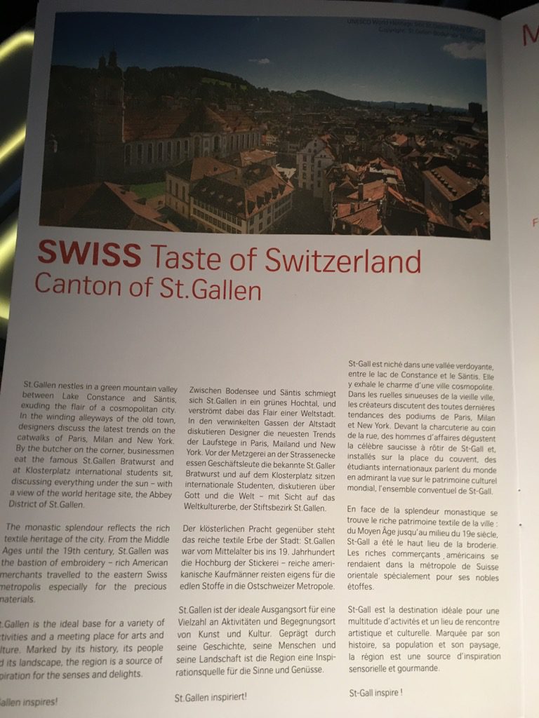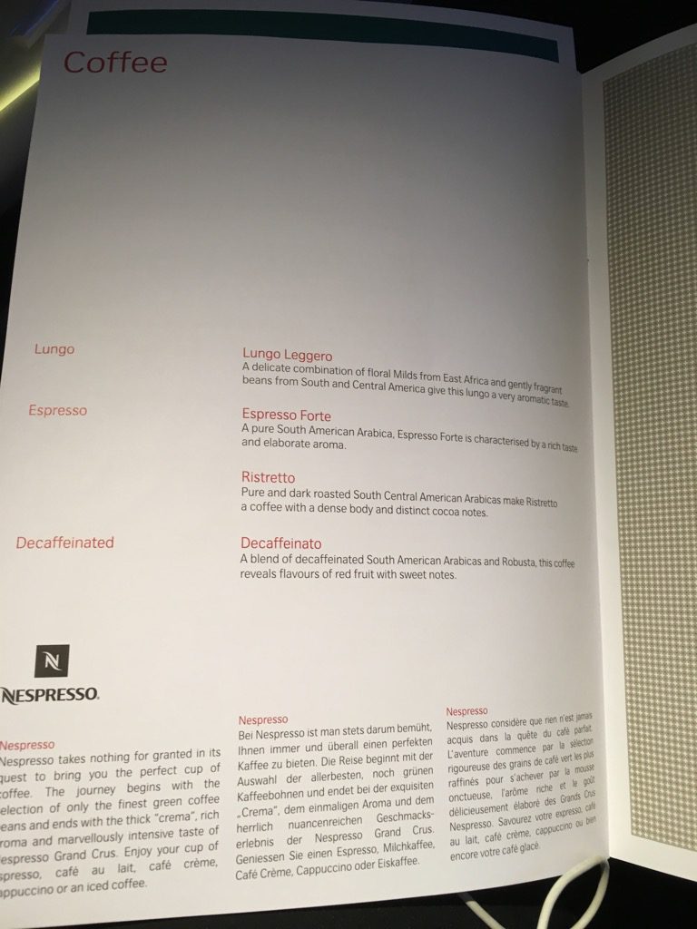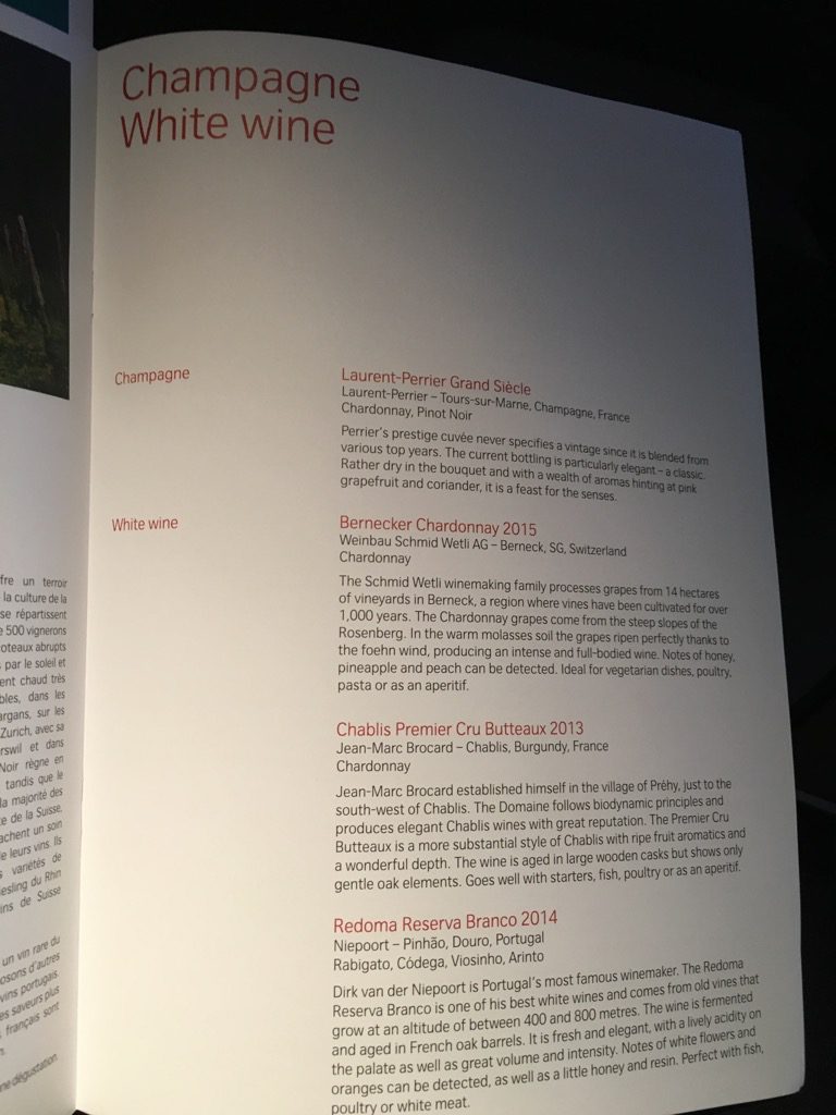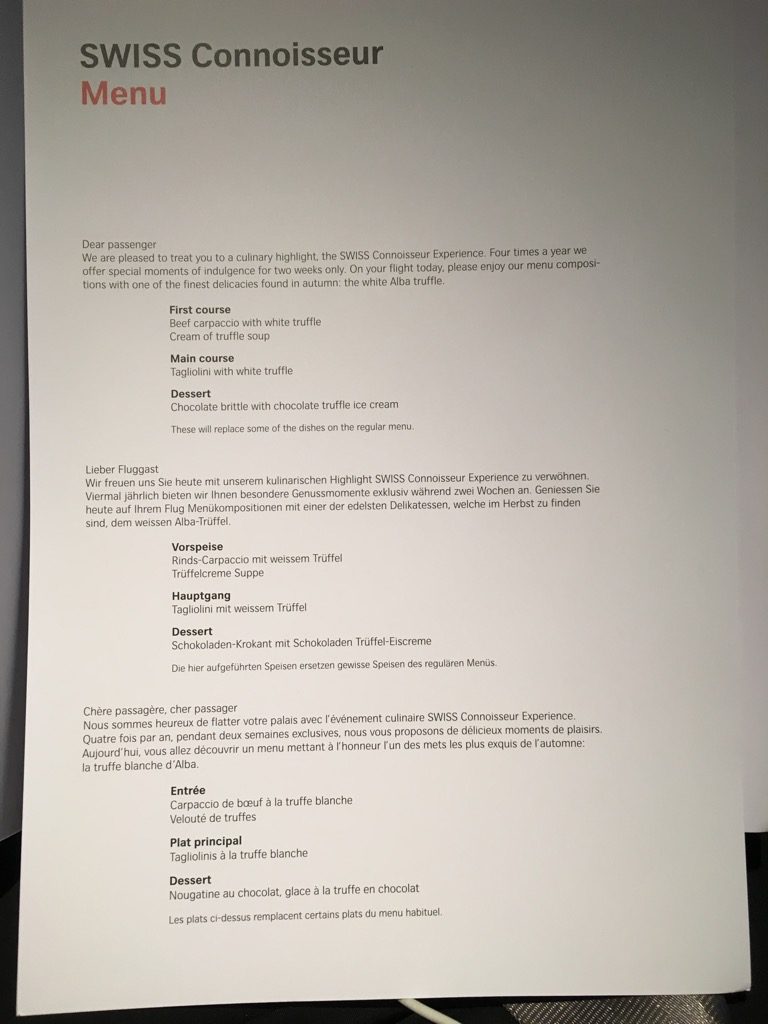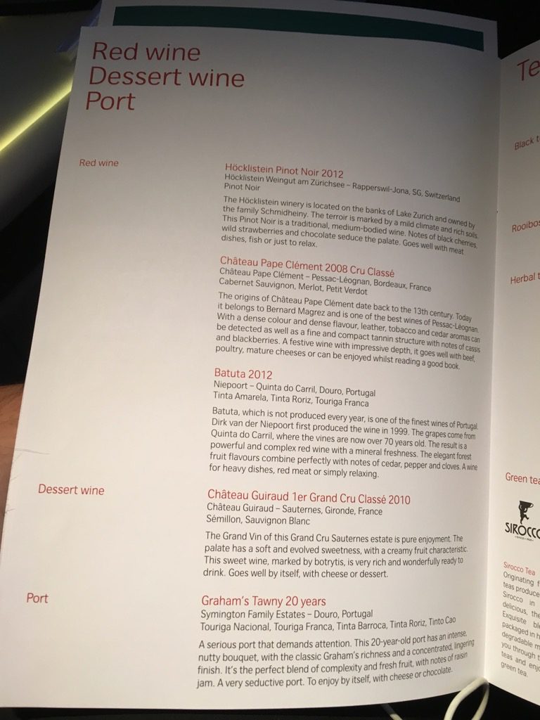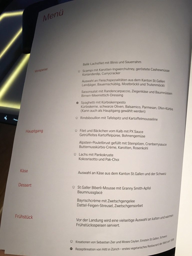 Der Start in Zürich erfolgte nach 23 Uhr und kaum waren die Anschnallzeichen ausgeschaltet begann die Crew mit dem Service. Die Menükarte wurde uns bereits am Boden überreicht und die Essenswünsche abgefragt.
