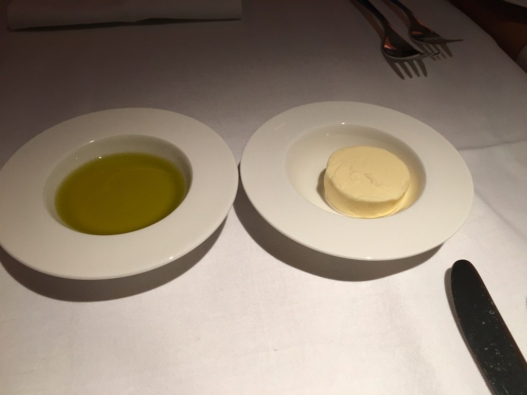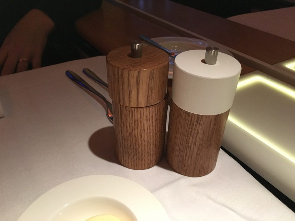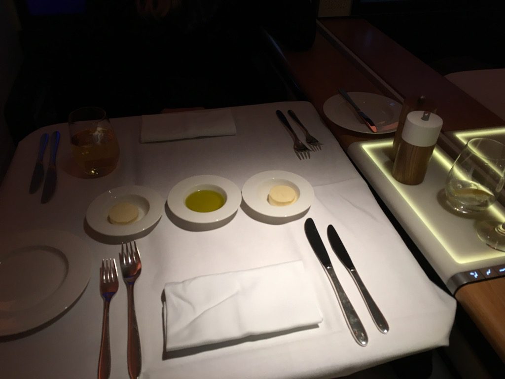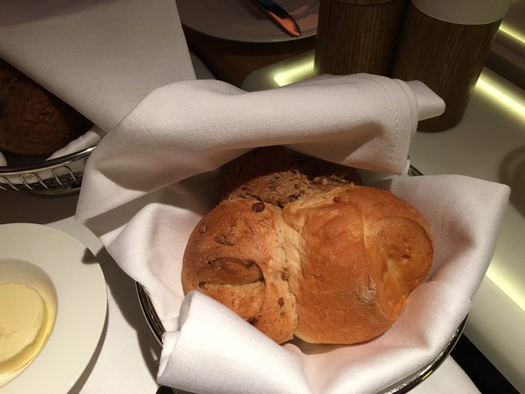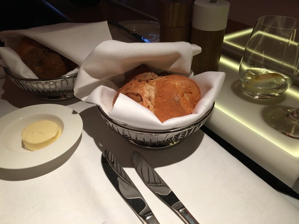 Neben Butter, Olivenöl, sowie großen Salz- und Pfefferstreuern bekommt jeder Gast der Swiss First Class auch einen eigenen Brotkorb mit frisch aufgebackenem Brot.