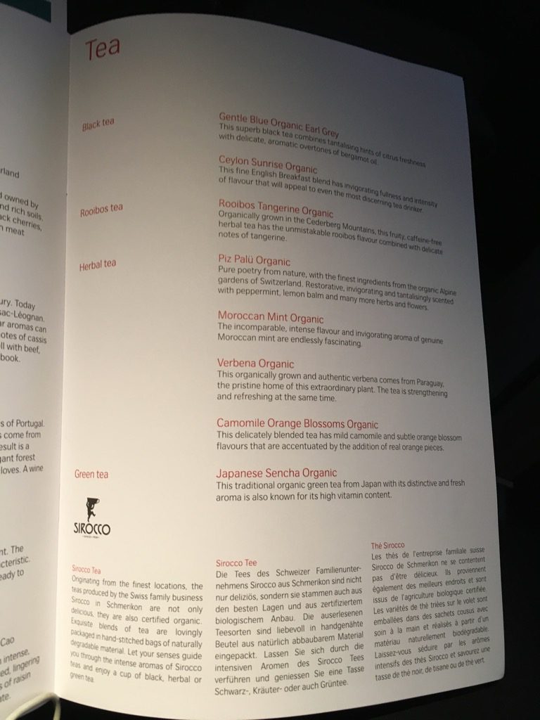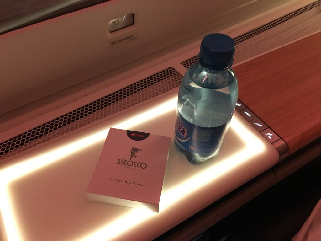 Neben dem Wasser, welches die Flugbegleiter beim Turn Down Service ans Bett stellen, gab es auch eine kleine Packung Sirocco Tee.