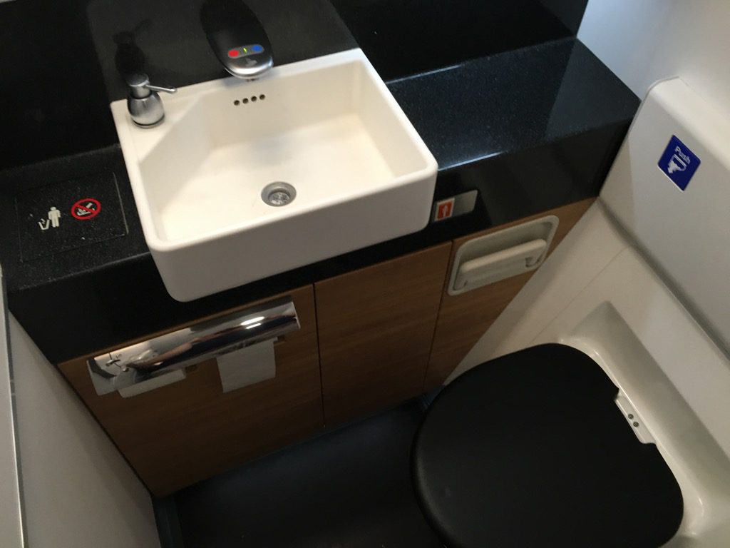 Mit der Boeing 777-300er hat man bei Swiss nun auch endlich zwei Toiletten für die First Class vorgesehen. Diese befinden sich beide neben der Galley und der Cockpittür. Die Toiletten selbst unterscheiden sich kaum von einer normalen Flugzeugtoilette. Allerdings sind die First Class Toiletten in der Swiss Boeing 777 recht ansprechend gestaltet und werden den ganzen Flug über in einem tadellosen Zustand gehalten. Auch Hand- und Gesichtscreme der Schweizer Luxusmarke la Prairie findet man in den Toiletten. Teurer geht es schon fast nicht mehr!