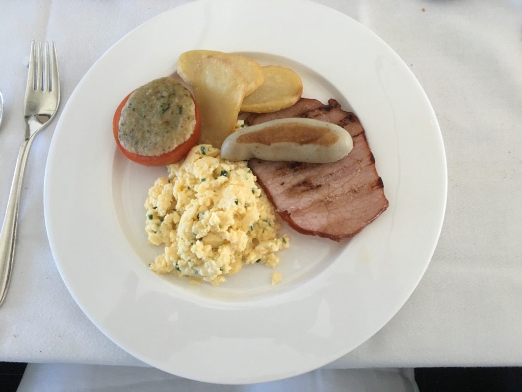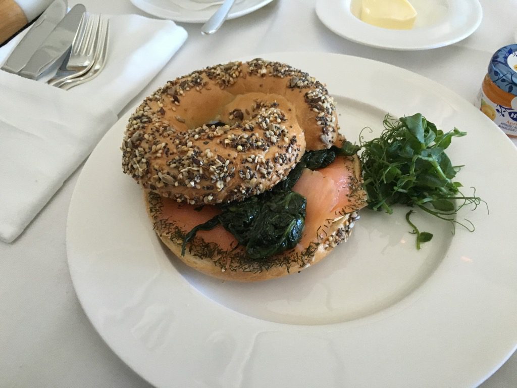 Als warme Frühstücksoptionen gab es einen lauwarmen Lachs Bagel mit Spinat, oder Rühreier mit Beilagen. Der Bagel war wirklich gut. Das Rührei wird bei Swiss leider nicht frisch zubereitet, sondern nur aufgewärmt. Dennoch war es absolut in Ordnung.