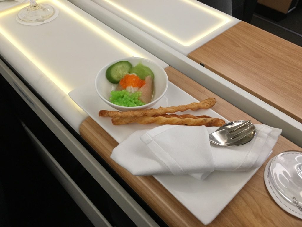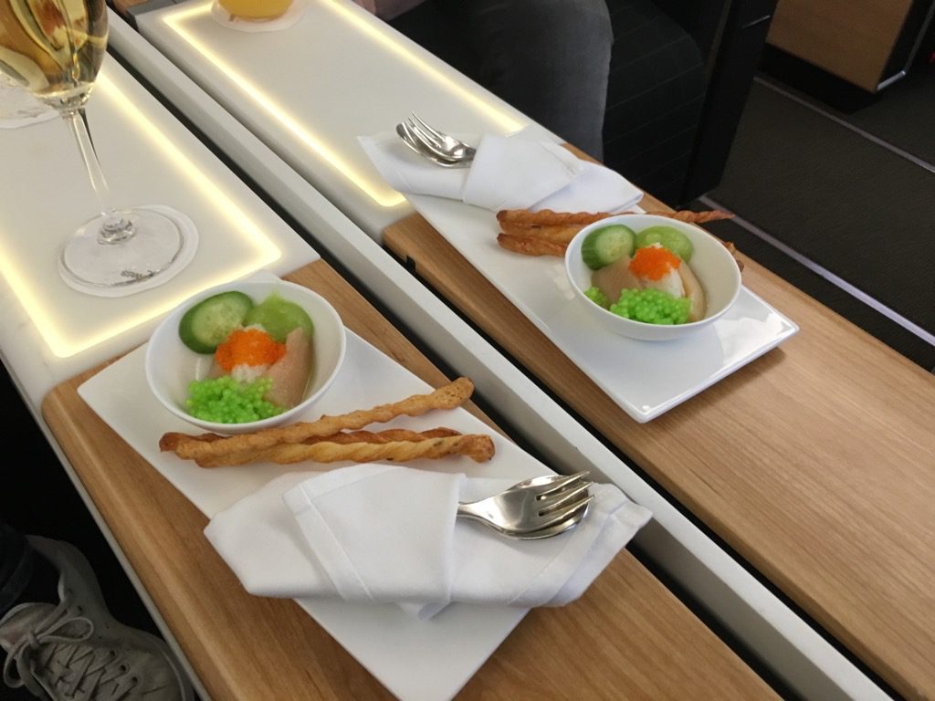 Neben dem Champagner wurden auch sofort noch drei Wasser geliefert. Auch der Gruß aus der Küche, welcher bei Swiss immer schon am Boden serviert wird ließ nicht lange auf sich warten.