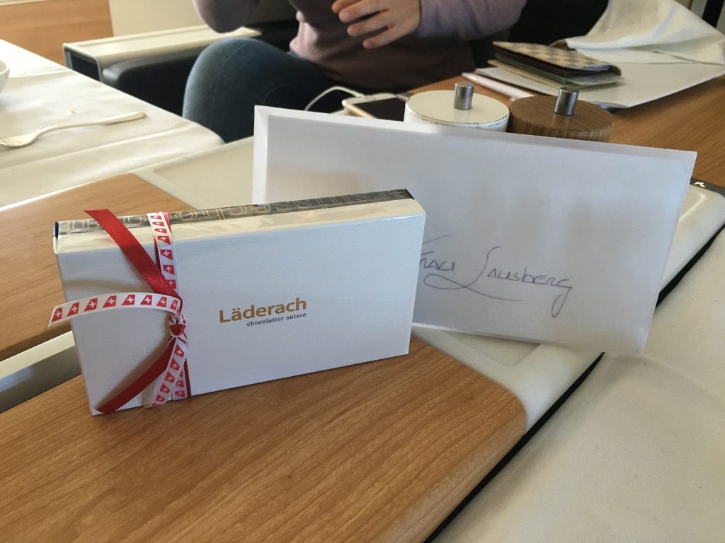 Kurz vor der Landung in Hongkong kam noch der Maître de Cabine, sammt First Class Flugbegleiter zu meiner Schwester um ihr mit einer handgeschriebenen Karte zum Geburtstag zu gratulieren. Auch eine Packung Pralinen gab es als Geschenk. Eine wirklich nette Geste!
