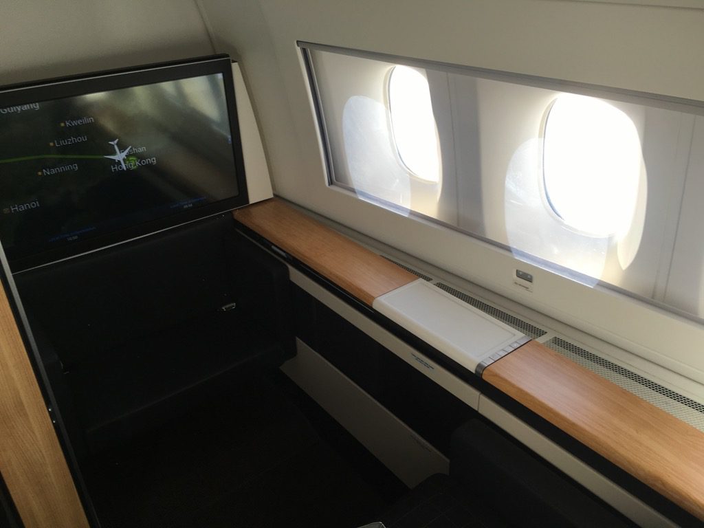 Wir haben die Lounge recht spät verlassen, sodass wir fast die letzten Gäste waren, welche für den Flug nach Hongkong eingestiegen sind. Zu unserer Freude waren wir drei heute mit einem alleinreisenden Mann die einzigen Gäste in der First Class nach Hongkong.