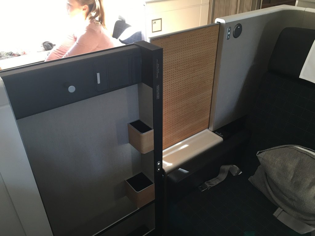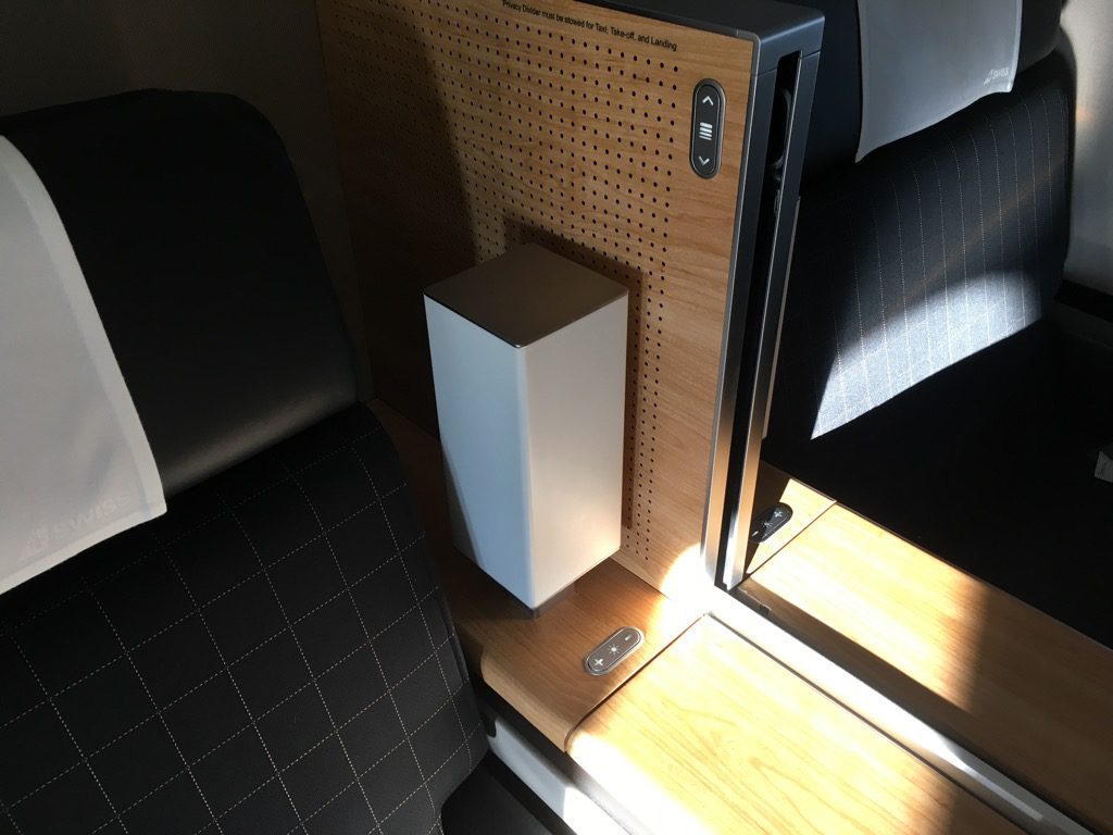 Mit Hilfe dieser Fächer lässt sich der Swiss First Class Sitz komplett abschirmen. Allerdings kommt hierbei kein Suitefeeling auf, da die Wände doch sehr niedrig sind.