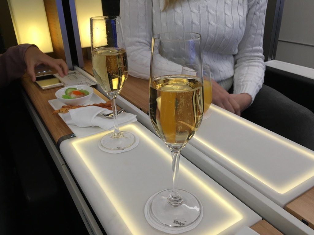 Nachdem wir all unsere Sachen verstaut und Platz genommen hatten, standen beide First Class Flugbegleiter mit einer Flasche Champagner bei uns und begrüßten uns nochmals sehr herzlich.