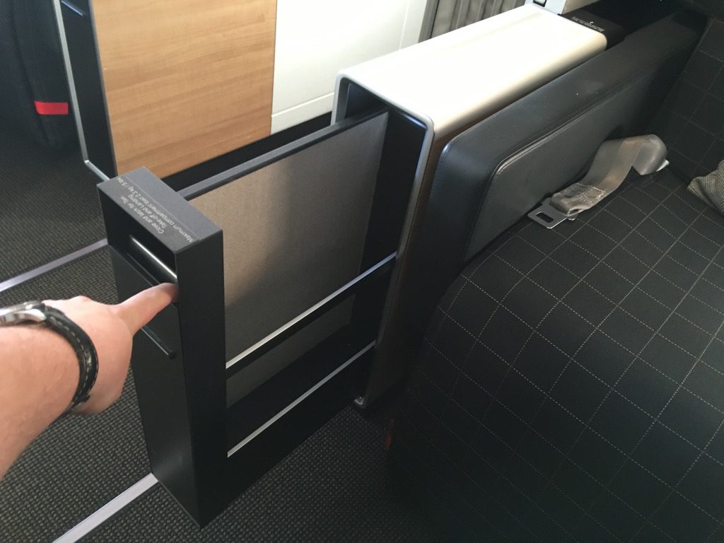 Wie schon erwähnt verfügt der Swiss First Class Sitz über jede menge Ablagemöglichkeiten. Neben den großen Staufächern neben den Sitz, Findet man noch einige Auszugsregale. Neben einem kleine Schuhfach, gibt es auch eine recht große ausziehbare private Garderobe. Hier sind auch kleine Flächen, wie z.B. für Brillen, Handys und Pässe angebracht. Auch einen kleine Schminkspiegel gibt es hier. Ich habe die Garderobe übrigens nicht genutzt, da mein Mantel schon vor dem Start von den Flugbegleitern verstaut wurde.