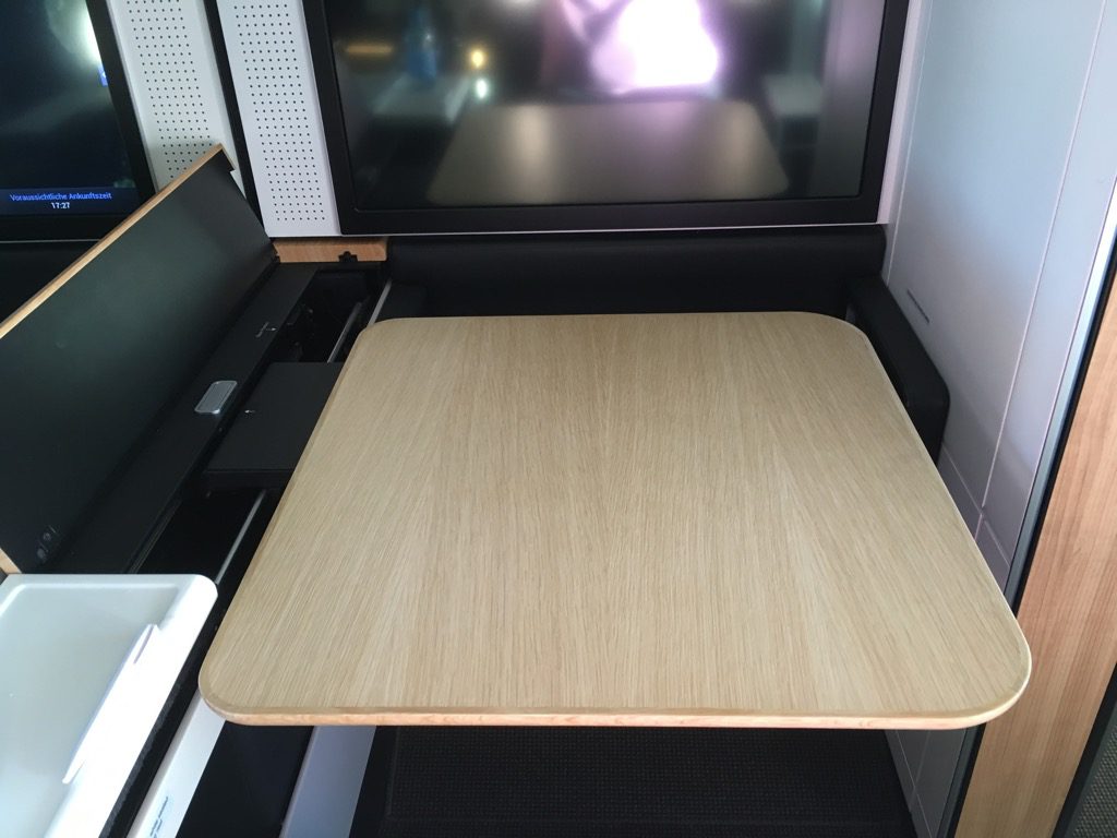 Damit man auch wirklich angenehm zu zweit essen kann, ist der Sitz mit einem riesigen Tisch ausgestattet. Dieser ist leider nicht mehr geteilt und klappbar. Hierdurch wird er zwar sehr stabil, ist allerdings etwas unhandlich. So können nicht zwei Passagiere im Sitz sitzen, wenn man den Tisch ausklappt.