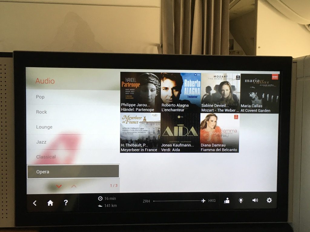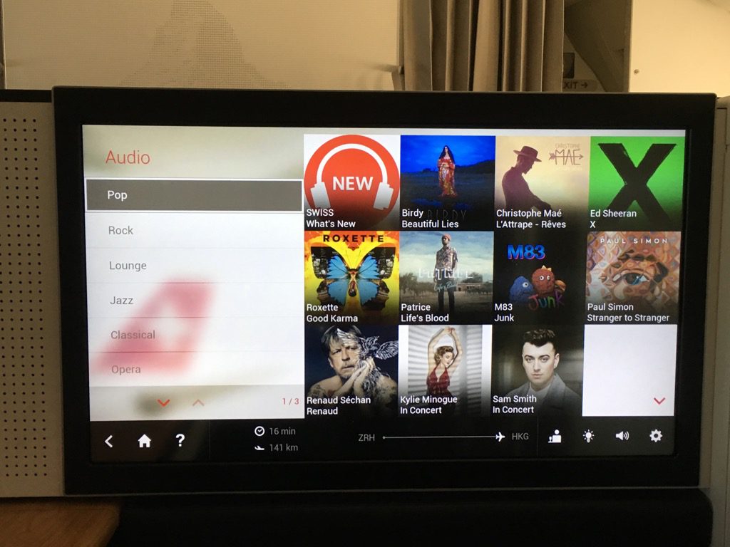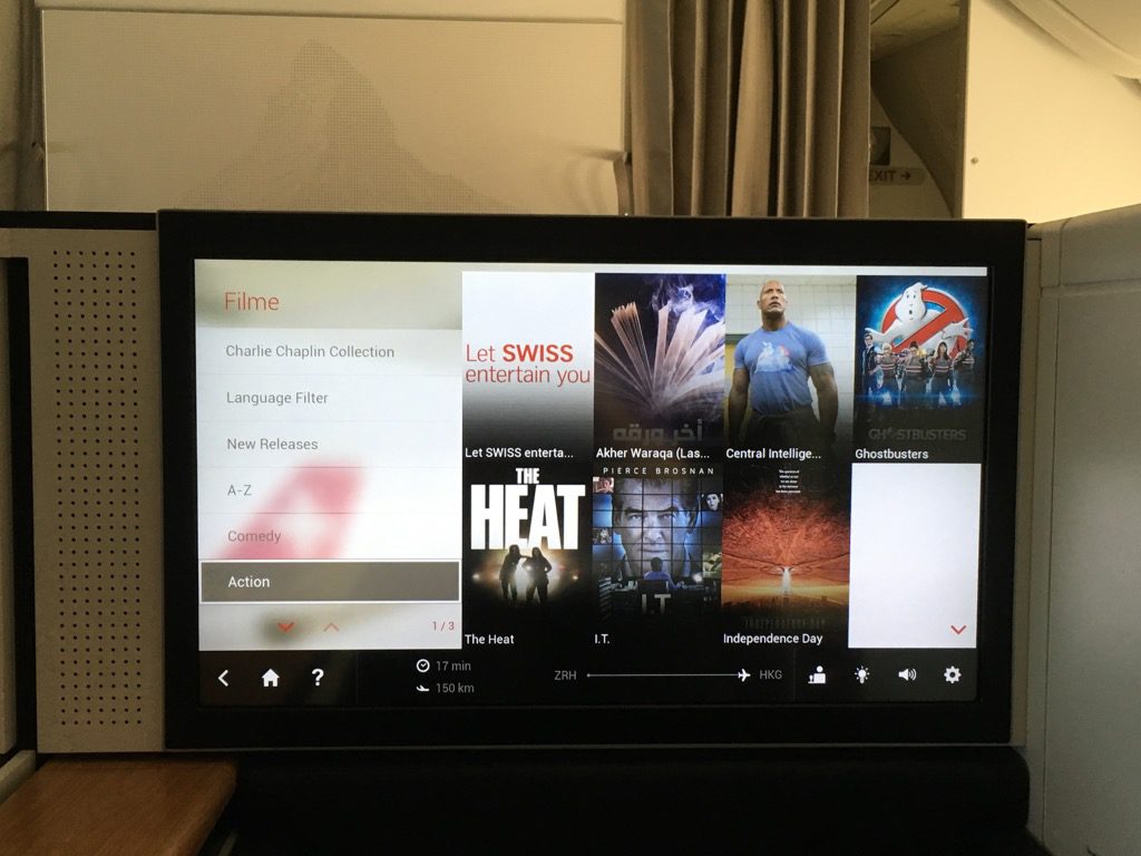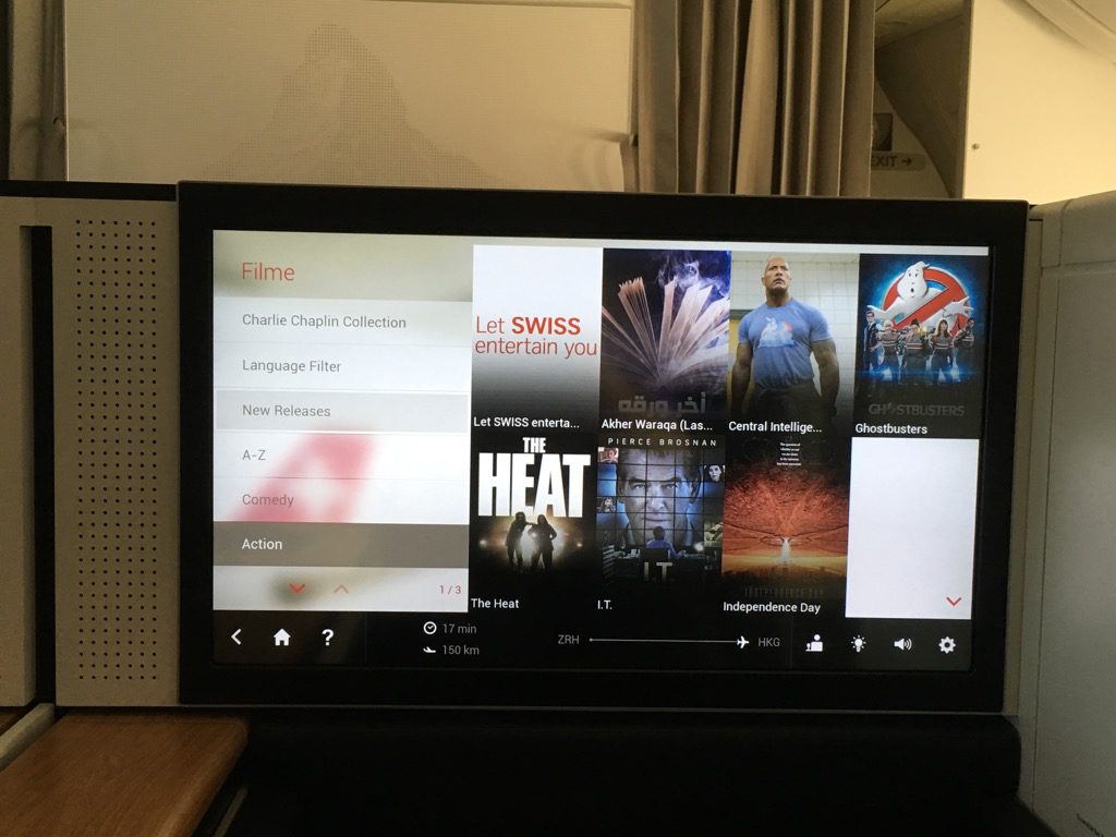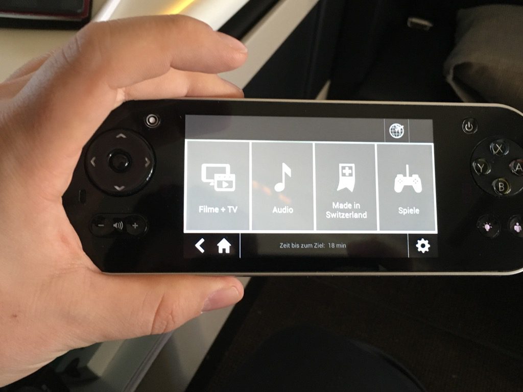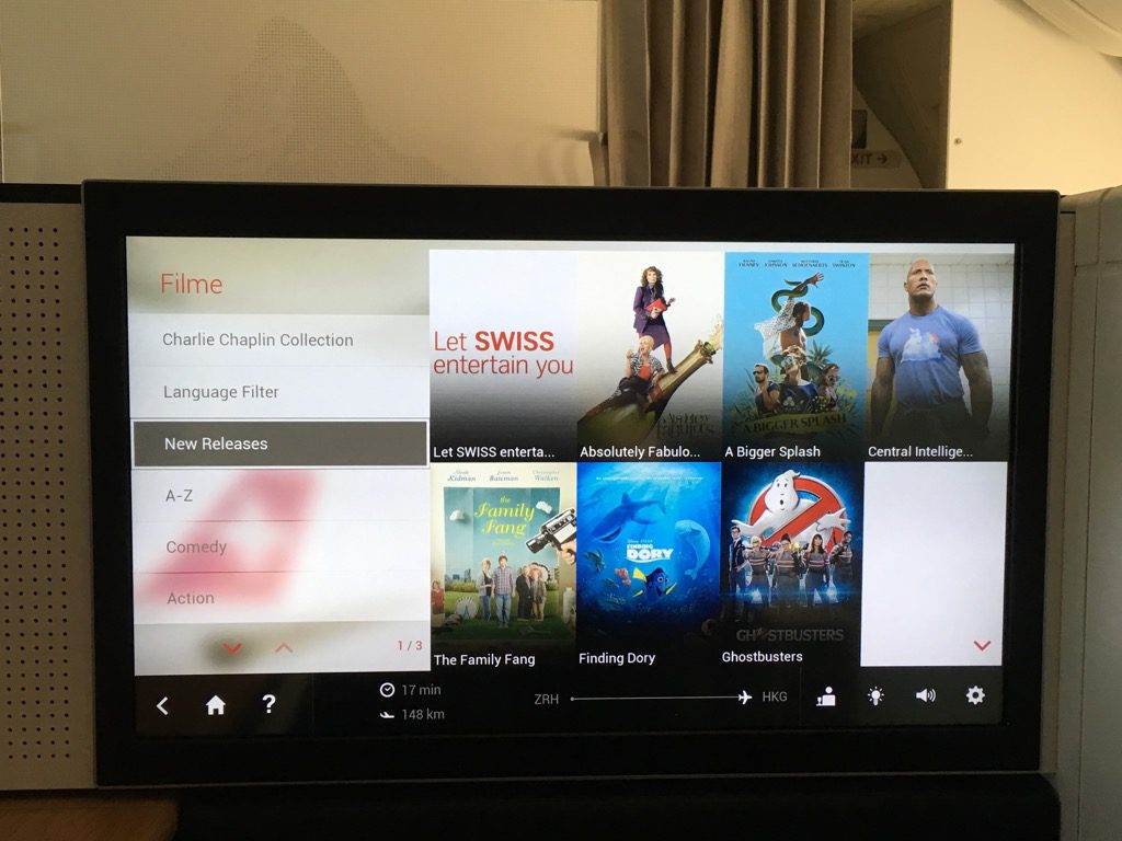 Der Swiss First Class Sitz verfügt über einen riesigen IFE Bildschirm. Dieser lässt sich über eine Touchscreenfernbedienung bedienen. Die Auswahl an Filmen, Serien, Musik und Spielen ist wirklich umfangreich. Allerdings habe ich das IFE auf diesem Nachtflug nicht genutzt. Positiv ist mir allerdings aufgefallen, dass man auf der Fernbedienung die Karte einblenden kann, während man einen Film schaut.