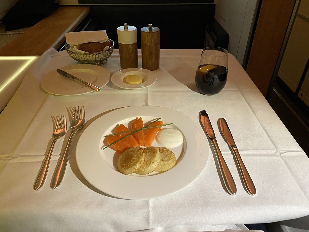 Das Menü, welches aus Produkten aus dem schweizerischen Kanton Zug zubereitet wird, wurde mit Swiss Klassikern und einem Tagesgericht ergänzt, welches bei der Menü Wahl noch mal ausführlich vorgeschlagen wurde. So selbstverständlich wie der Kaviar in der Lufthansa First Class ist, ist es ebenso der Balik-Lachs in der Swiss First Class. Normalerweise bin ich kein Fisch-Freund, jedoch hat mich der Lachs geschmacklich überwältigt.