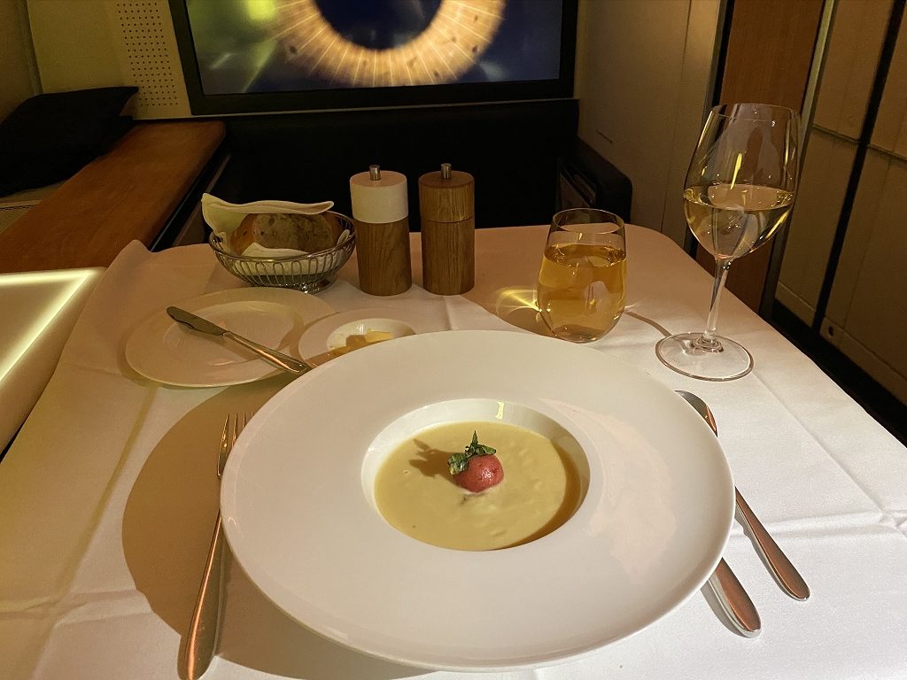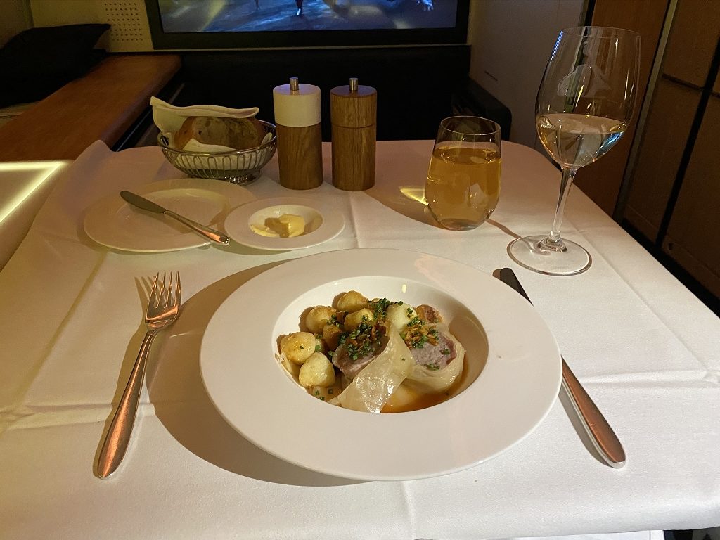 Immer präsent, jedoch nie aufdringlich waren beide Flugbegleiter, welche versuchten zügig durch das Menü zu kommen, um uns Gästen ein Maximum an Schlaf zu ermöglichen. So folgte auf den Balik-Lachs eine Weißweinsuppe mit Buttermilch und als Hauptgang das Tagesgericht, eine Art Roulade.