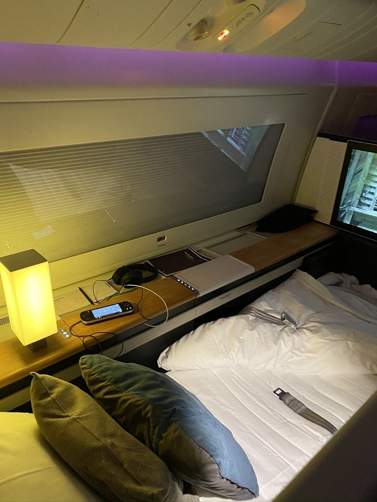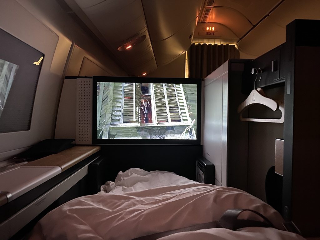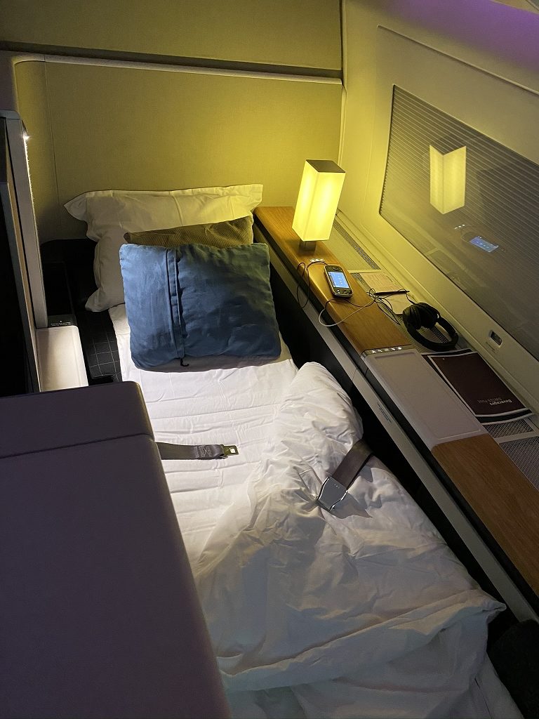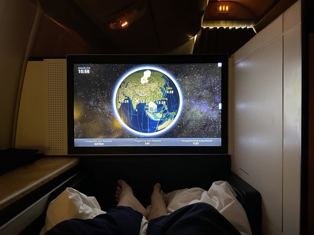 Kurze Zeit später wurde mir mein riesiges Bett zurechtgemacht, während ich mich umzog und wusch. Und damit ging sehr schnell, wie schon häufig an diesem Tag, der erste Teil des Fluges vorbei.