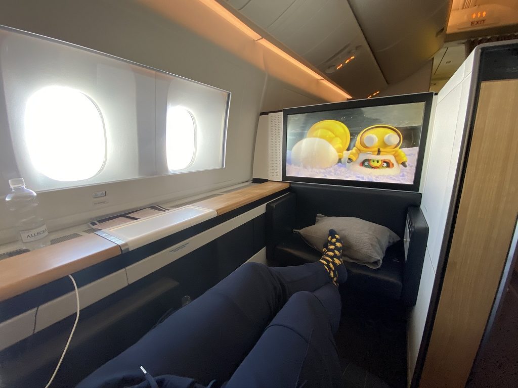 Seine wahre Stärke spielt der Sitz in der Nacht bzw. immer dann aus, wenn Ihr schlafen wollt. Mit 203 cm sollte keiner mit den Füßen am Hocker anstoßen oder mit dem Kopf am Sitz. Entgegen wirken hierbei auch die sehr bequemen Kissen. Zum Schlafen wird der angenehme Sitz mittels einer Matratze noch bequemer gemacht und bot zumindest mir den besten Schlaf, den ich bis jetzt an Bord eines Flugzeuges hatte.