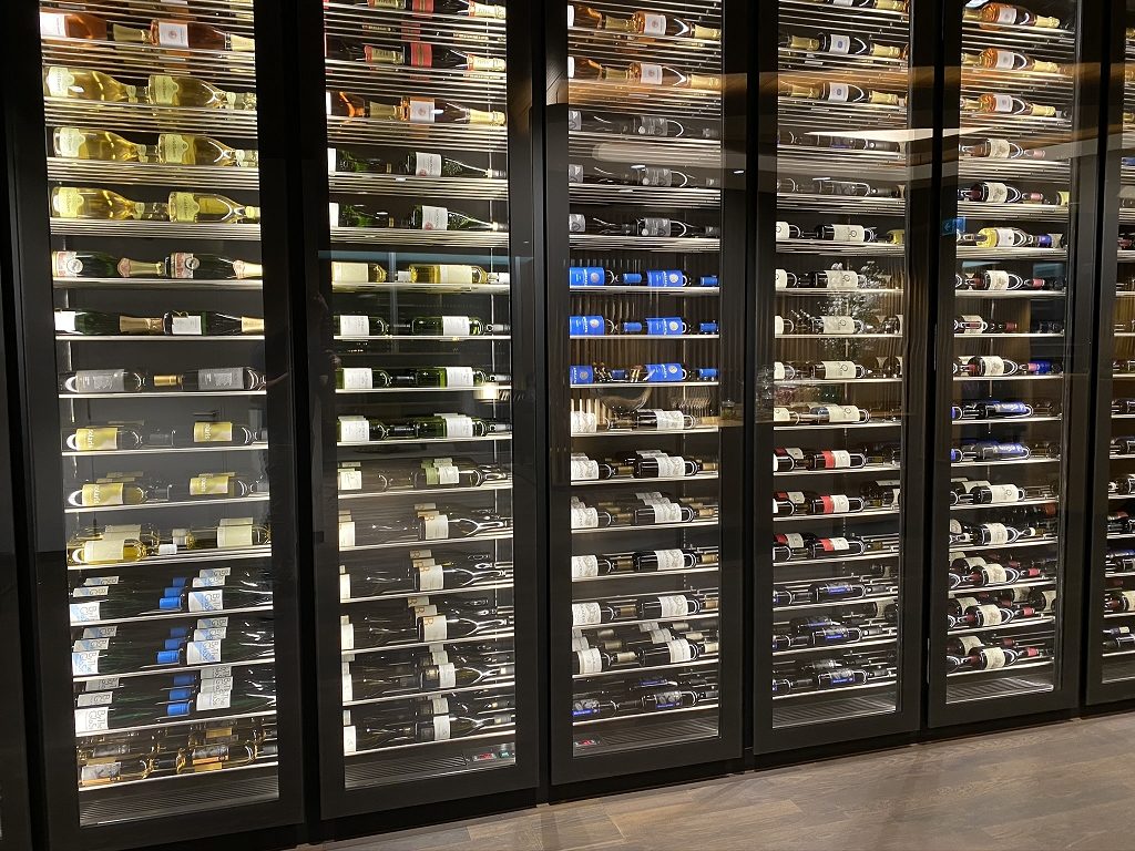 Angekommen in der Swiss First Class Lounge im Terminal E wollte ich etwas Essen und bog hinter dem riesigen Weinhumidor nach links in den Dining-Bereich ab. Dieser hat mich ebenso wie die Lounge selbst mit ihrem schlichten und sehr hochwertigen Design nachhaltig beeindruckt.