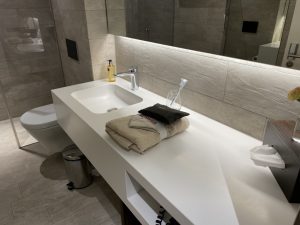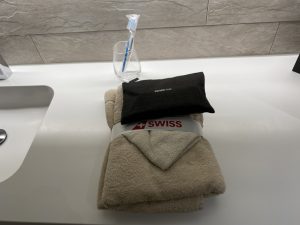 Die Swiss First Class Lounge Zürich Terminal A verfügt selbstverständlich über eigene Bäder inklusive Duschen und Toiletten. In jedem Badezimmer liegt bereits ein Bademantel und ein Lounge-Amenity Kit bereit. Die komplette Lounge war sehr sauber und gepflegt!
