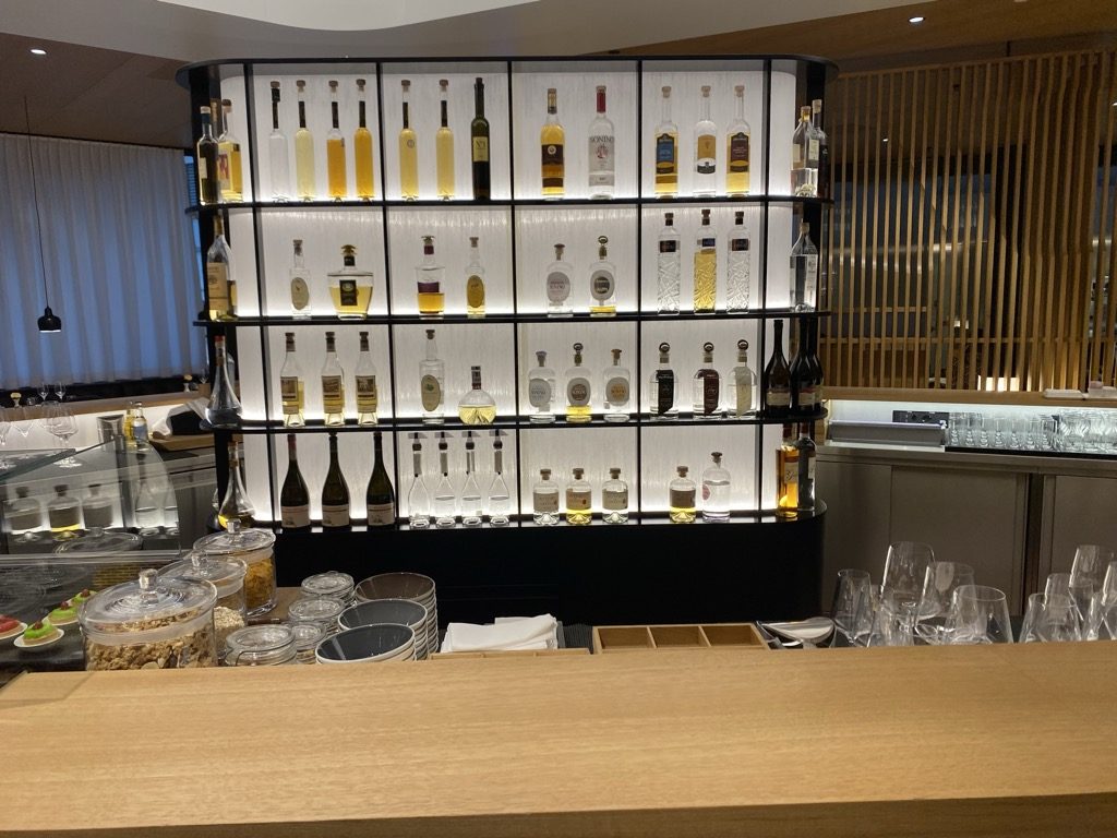Am Ende dieses Ganges führt eine Treppe in die eigentliche Lounge. Hier befand sich links direkt die beeindruckende Bar, an der so einige Spirituosen zu finden waren.
