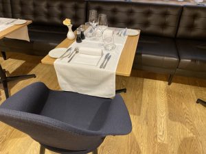 Hinter der Bar konnte man an Tischen im á la Carte Restaurant Platz nehmen und speisen. Die Tische waren einladend gedeckt. Zum Zeitpunkt unseres Besuchs hatten wir noch keinen Hunger, weswegen wir unser Abendessen später in der First Class Lounge an den E Gates einnahmen.