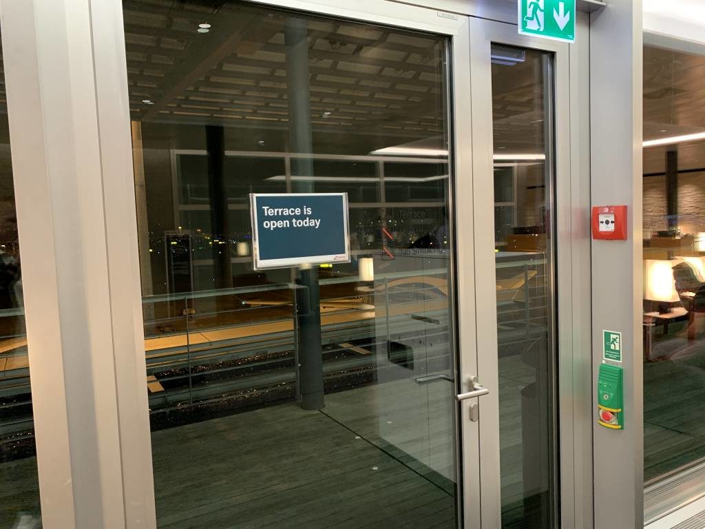 Über die gesamte Länge der Lounge gibt es immer wieder Glastüren, die Euch Zutritt zur Terrasse gewähren. Soweit die Terrase am jeweiligen Tag geöffnet ist. Auf der Terrasse befinden sich noch mal ein paar wenige Sitzgelegenheiten und am Geländer sind immer wieder Ferngläser angebracht, mit denen Ihr das Geschehen auf dem Rollfeld besser beobachten könnt.