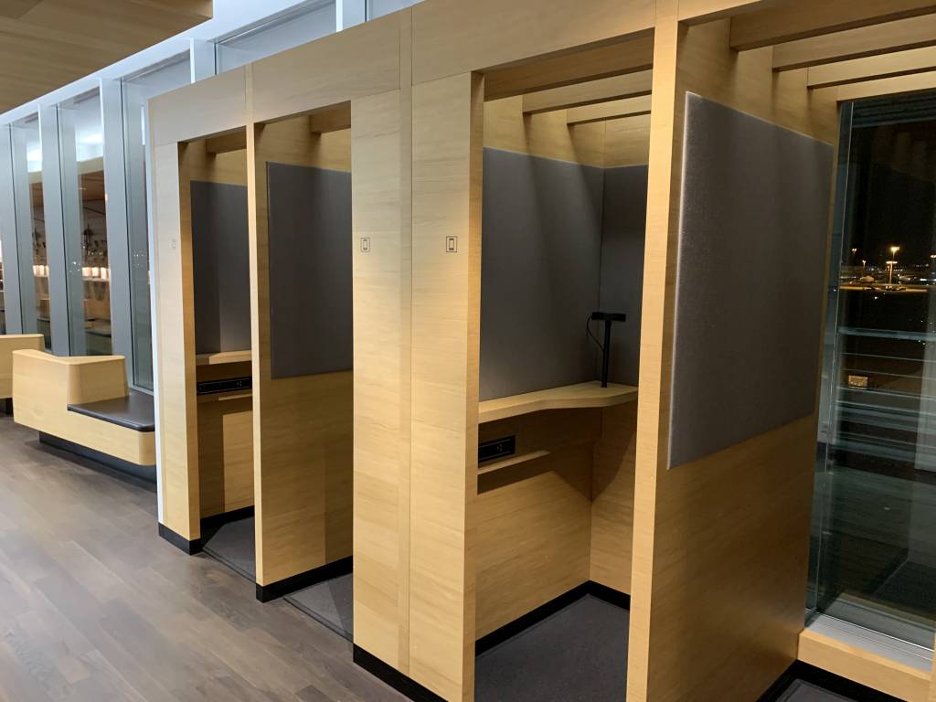 In der gesamten Lounge finden sich dunkelbraune Ledermöbel. Tische und andere Konsolen sind entweder in weiß oder aber in hellem Holz gehalten. Ganz im typischen Swiss-Stil. An den meisten Sitzplätzen befinden sich Steckdosen und USB-Anschlüsse.