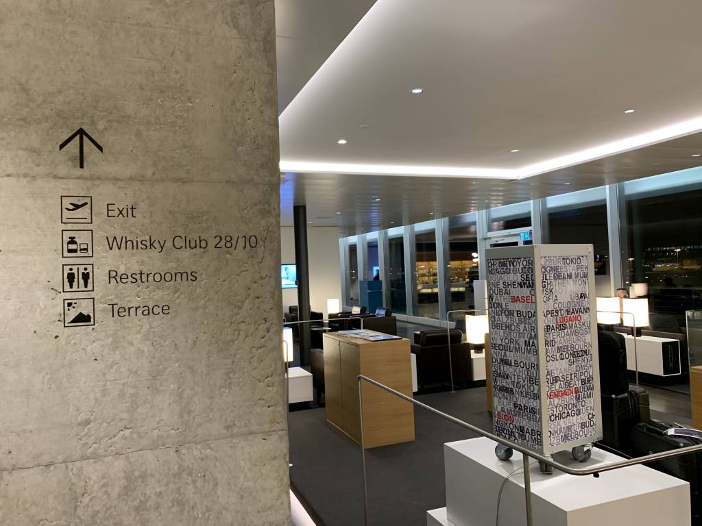 Die Swiss Senator Lounge im Satellitenterminal bei den E-Gates ist von der Fläche schon beeindruckend. Wendet Ihr Euch direkt nach der Glasschiebetür nach links, kommt Ihr in den Whiskey Club 28/10. Die eigentliche Lounge befindet sich, wenn ihr nach rechts wendet.