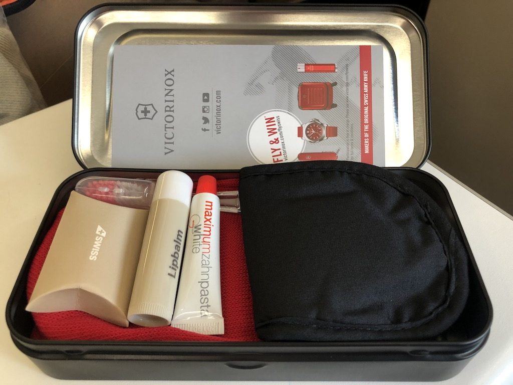 Alles was man von der Swiss-Langstrecke kennt, darf man auch auf dem kürzeren Flug erwarten. Das Unterhaltungsprogramm steht zur vollen Verfügung, bei den Kopfhörern gibt es allerdings noch Verbesserungsbedarf, insbesondere beim Tragekomfort und der Geräuschunterdrückung. Ein Kleiderbügel und das Amenity-Kit waren bereits am Sitz, in den Waschräumen stehen erfrischende Sprays und Cremes bereit.