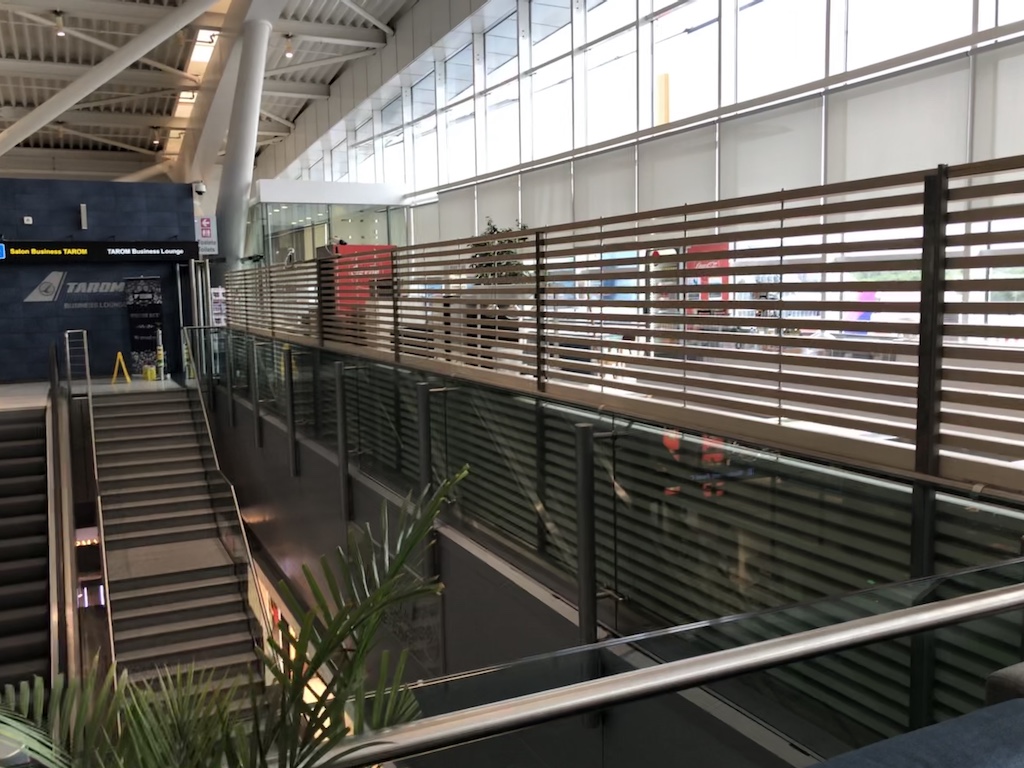 Die Lounge ist die einzige, die Tarom selbst betreibt. Die Einrichtung liegt ziemlich mittig im langgezogenen Terminal und ist über Treppen erreichbar. Sie befindet sich über den Abfluggates und ist komplett offen. Das bedeutet man bekommt Umgebungsgeräusche und Ansagen vom laufenden Flugbetrieb mit. Diese können beispielsweise bei einem Telefonat stören.