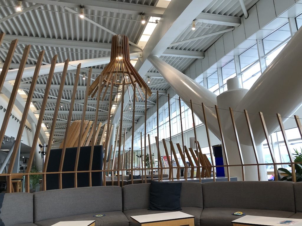 Die Lounge erstreckt sich am Panoramafenster des Terminals und erlaubt von vielen Stellen einen Blick auf das Vorfeld. Der Internetzugang ist kostenfrei und stabil, Steckdosen gab es nur in Buchsen die im Fußboden verbaut sind. Zum Laden von kleineren Geräten gab es Schließfächer mit Ladekabeln.