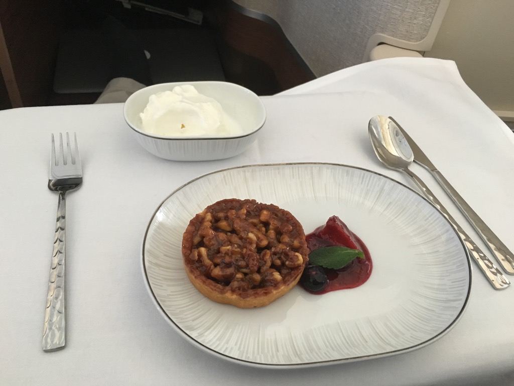Nach dem Dessert gab es noch eine Praline, ein Wasser und ein weiteres heißes Tuch. Auf Kaffee habe ich nach dem Essen verzichtet und mich danach sofort schlafen gelegt. Überraschenderweises habe ich trotz der Abflugszeit um 13 Uhr in Rom fünf Stunden schlafen können.