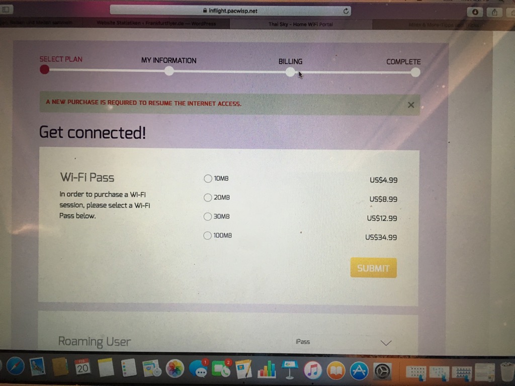 Nachdem ich nun gestärkt war, verbrachte ich die letzte Hälfte des Fluges damit ein wenig zu arbeiten und das IFE zu nutzen. Thai gibt allen Business Class Passagieren im Airbus A350 einen 5MB Voucher für das WIFI. Dies ist zwar eine nette Geste, allerdings kommt man hiermit natürlich nicht weit. Das WIFI kann man anschließend in verschiedenen Datenpaketen kaufen. Mit 35 US$ für 100MB ist es allerdings eher teuer.