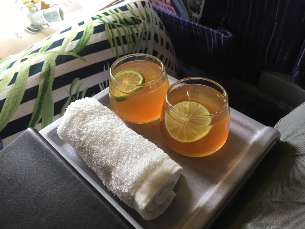 Vor dem Start wurden kalte Tücher und ein Welcome Drink angeboten. Dabei hatten die Business Class Passagiere die Wahl zwischen Saft, Wasser und einem kalten Tee, welchen ich sehr empfehlen kann.