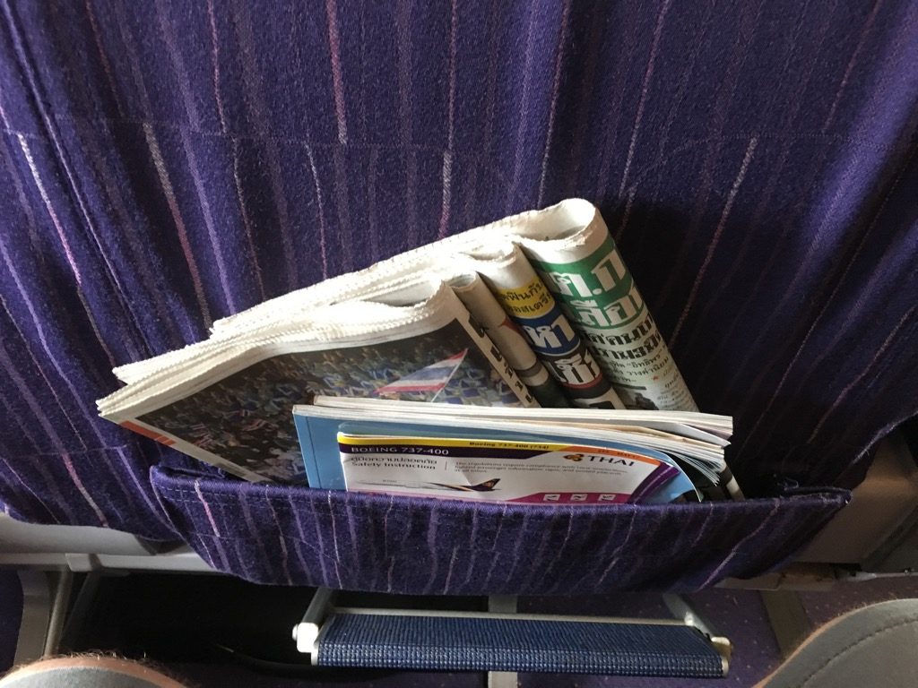 Die Thai Airways Boeing 737-400 verfügt über keinerlei Entertainment System, da man auf dem kurzen Flug nach Koh Saumi auch nicht wirklich eines benötigt. Am Sitz war allerdings noch, das nicht funktionierende, alte Radio installiert. Zusätzlich waren in der Sitztasche aller Business Class Sitze auch eine Reihe von Tageszeitungen.