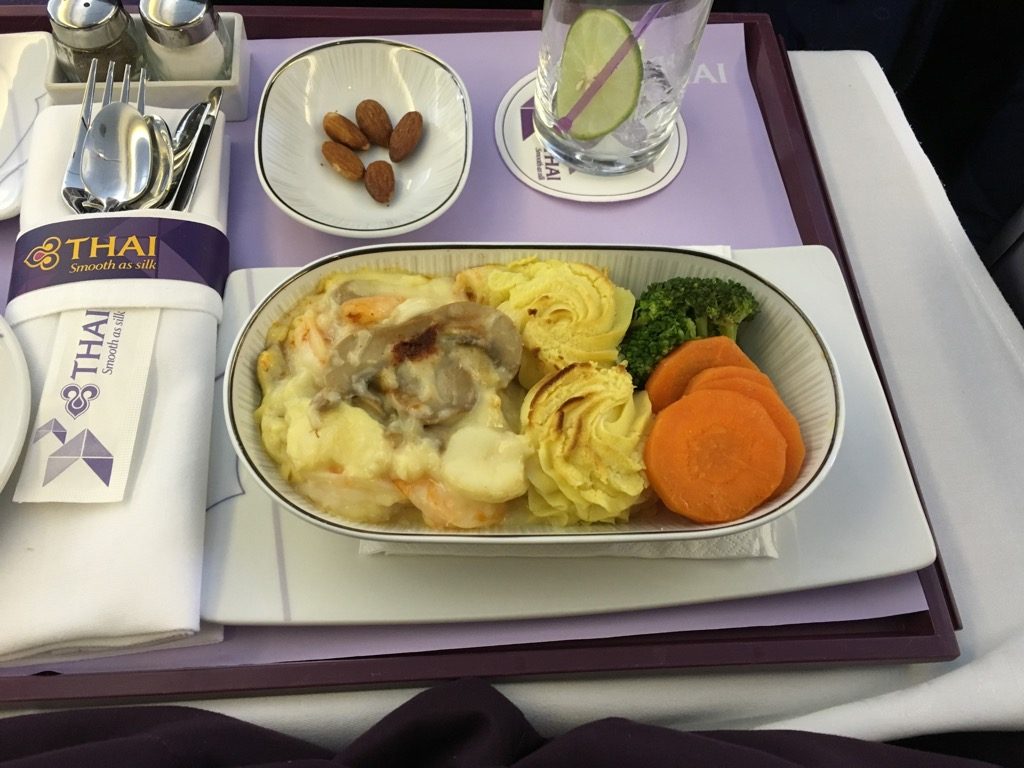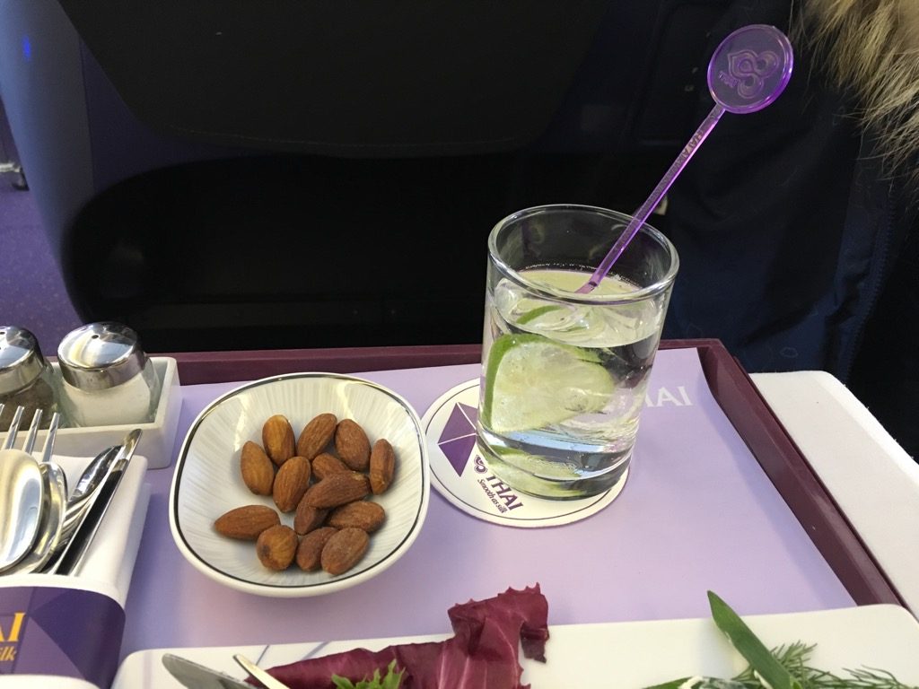 Grundsätzlich mag ich ja einen schnellen Service in der Business Class, allerdings verstehe ich nicht, warum man bei einem Flug mit Abflug vor 10 Uhr so auf die Tube drückt beim Service, wenn doch ein Mittagessen serviert wird. So hat man kurz nach 10 Uhr Ortszeit in Bangkok das Mittagessen im Flieger serviert.