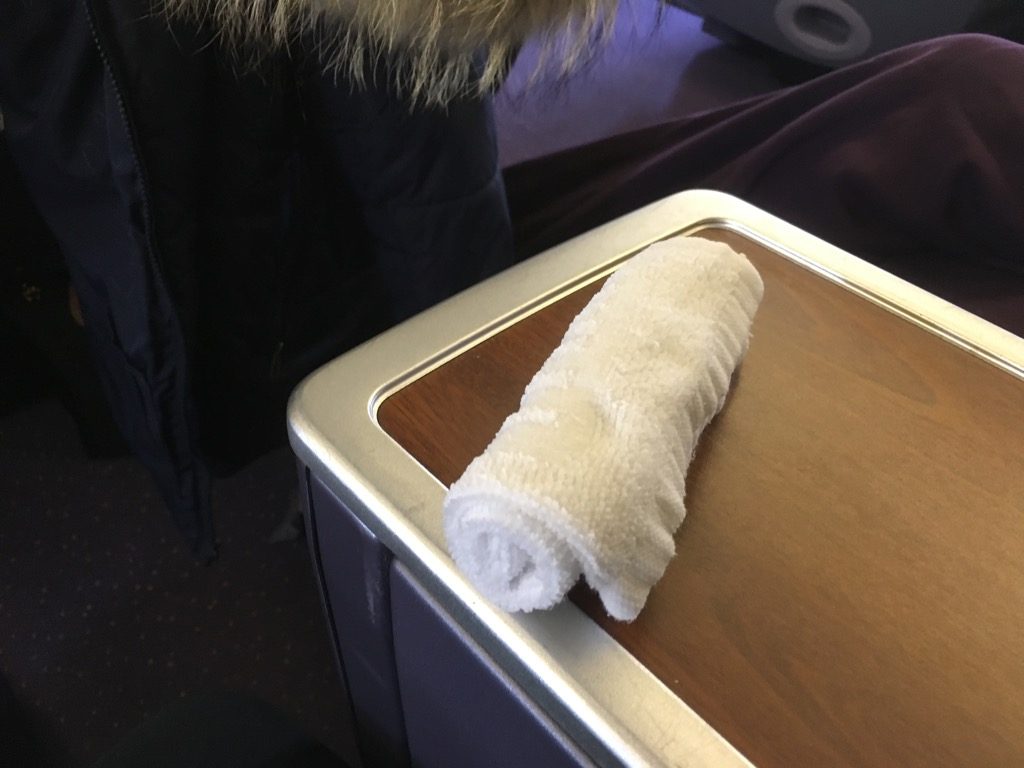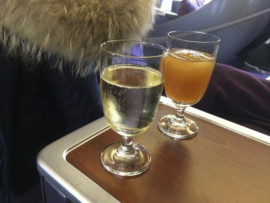 Noch am Boden wurden Welcome Drinks und heiße Tücher zur Erfrischung angeboten. Anders als auf den Langstrecken, gibt es auf den Kurz- und Mittelstrecken bei Thai leider keine „open Bar“ vor dem Abflug, sondern nur Wasser, Saft und Champagner zur Auswahl.