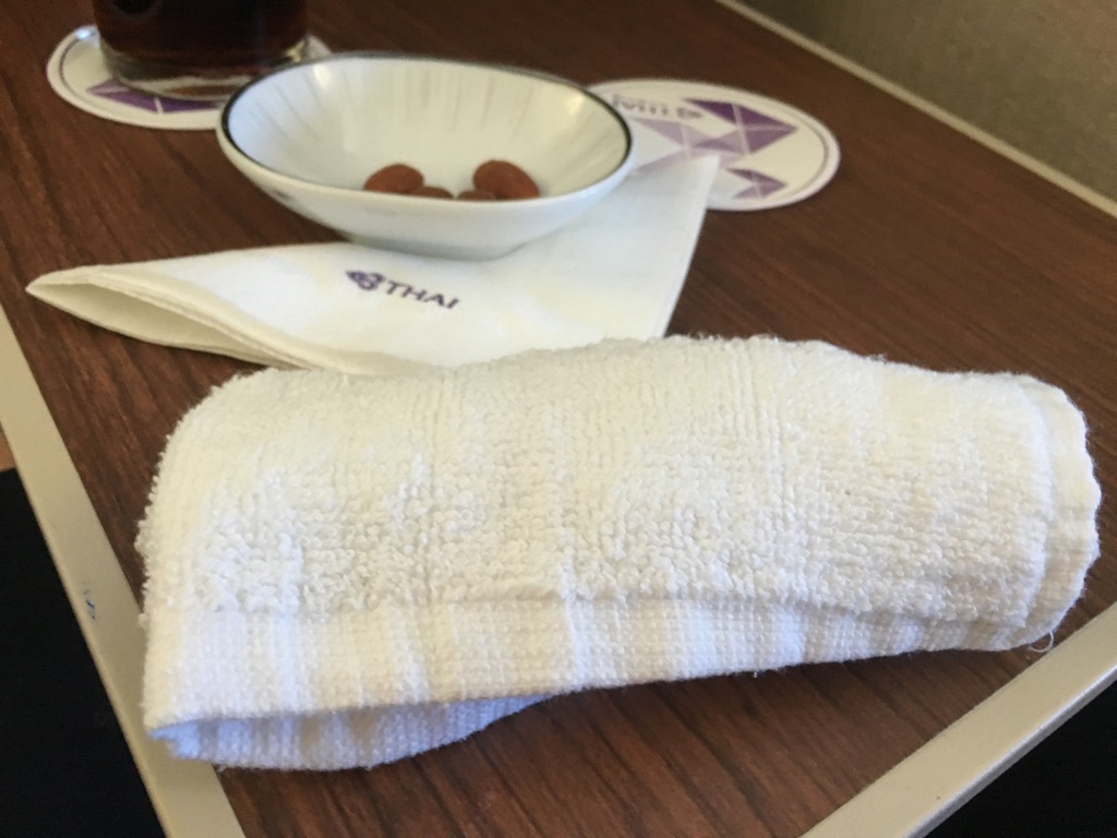 Wenige Minuten nach dem Start hat die Crew direkt mit dem Service begonnen. Mein Gin&Tonic wurde schnell zusammen mit Nüssen geliefert. Auch ein weiteres heißes Tuch gab es noch zu den Cocktails.
