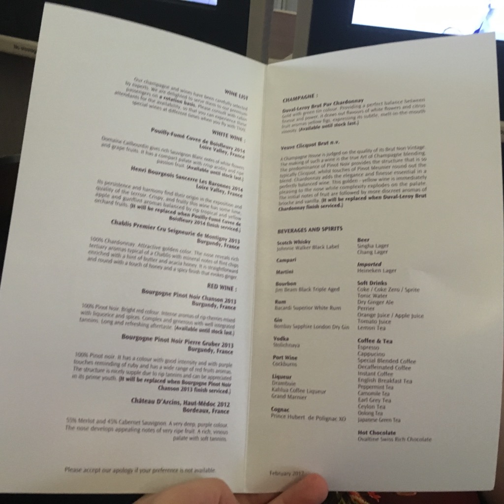 Auch vor dem Start wurden die Menükarten verteilt und schon die Wünsche für das Essen abgefragt. Obwohl wir noch beim Check In unterschreiben mussten, dass wir auch ohne Essen fliegen würden, hatte Thai natürlich auch für uns ein Essen geladen.