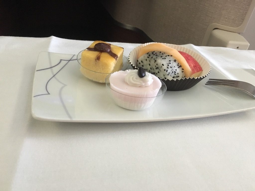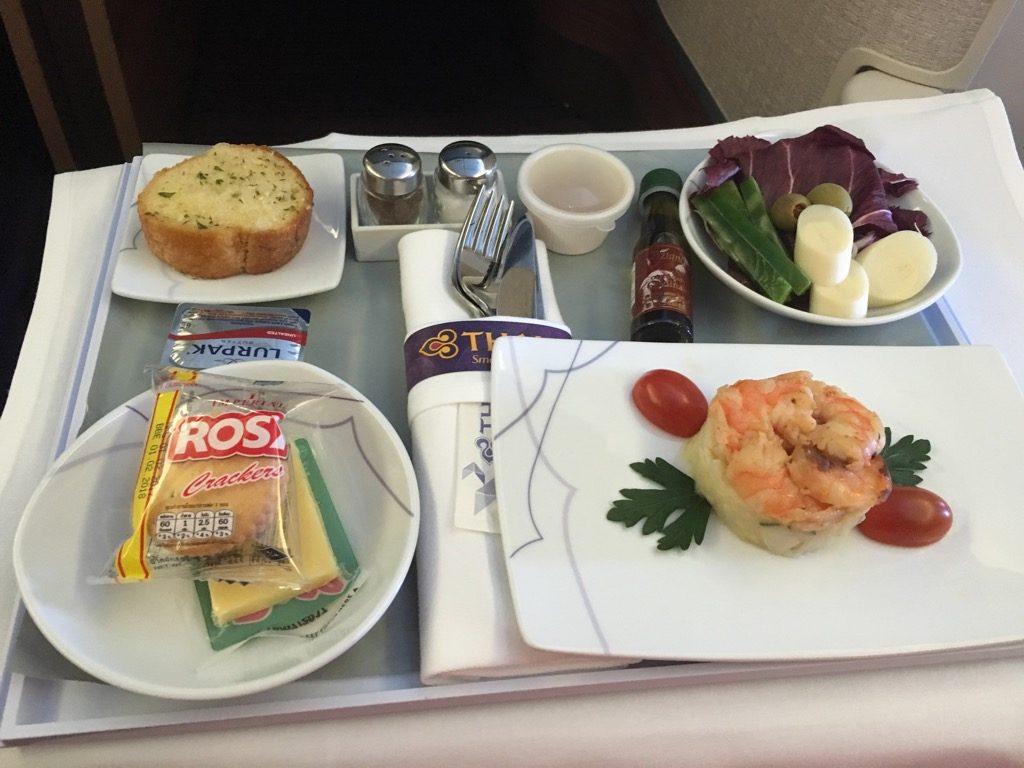 Wie bei Thai auf der Kurz- und Mittelstrecke üblich, wurde die Vorspeise auf einem Tablett zusammen mit dem Salat, Käse und Knoblauchbrot serviert.