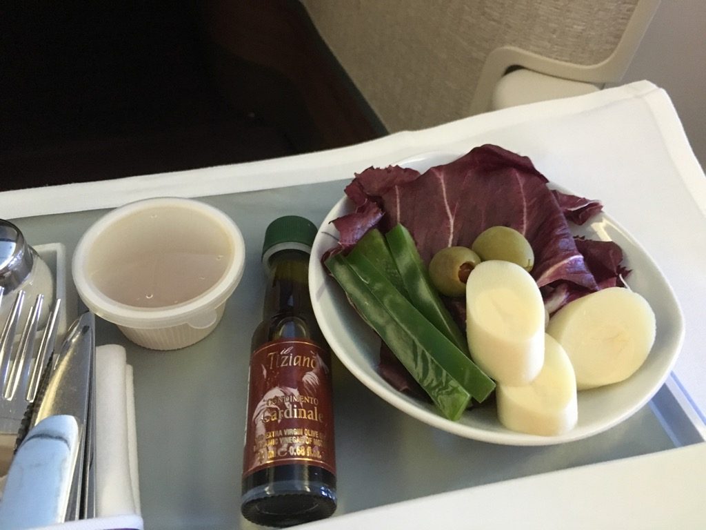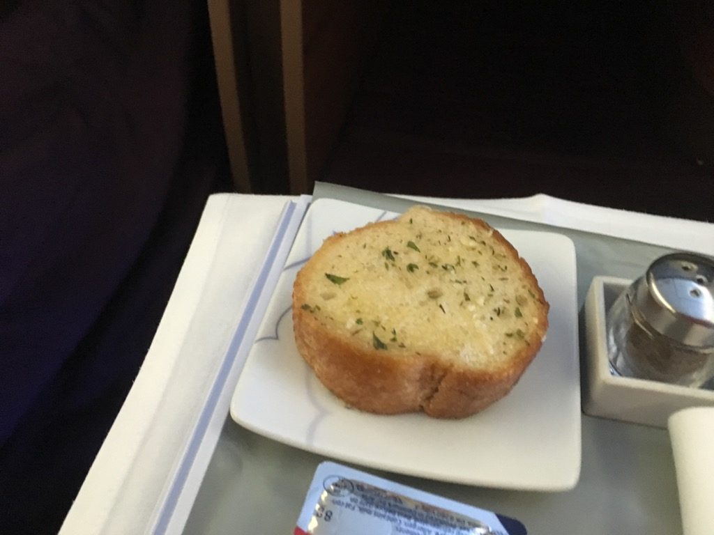 Die Garnelen als Vorspeise waren gut. Der Salat allerdings ein wenig eigen. Besonders der abgepackte Käse erinnerte allerdings mehr an die Economy Class, als an eine Business Class. Highlight der Vorspeise war allerdings das warme Knoblauchbaguette.