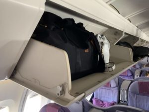 Wir zeigten beim Einstieg nochmals unsere Bordkarten vor und wollten mit unserem umfangreichen Handgepäck ins Upper-Deck marschieren. Allerdings nicht, ohne von oben abgefangen zu werden, weil das Handgepäck nicht in die Fächer des oberen Decks passt. Wir verstauten es daher unten, ohne für einen größeren Stau zu sorgen. Was uns passierte, passierte jedoch zahlreichen weiteren Fluggästen, die teilweise Ihr Gepäck schon nach oben geschleppt hatten. Während wir es gelassen hinnahmen, diskutierten andere Fluggäste lautstark.