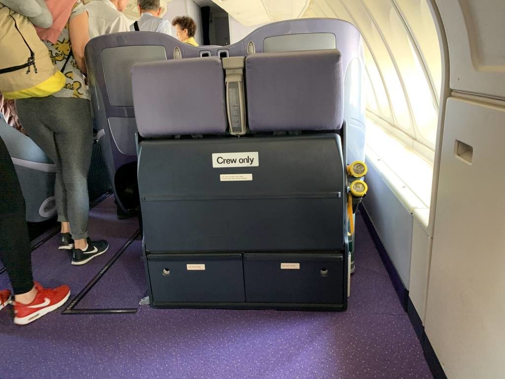Am Flughafen gingen wir dann zum wenig besuchten Schalter für Business Class Gäste. Der freundliche Mitarbeiter informierte uns allerdings, dass fast alle anderen Plätze bereits belegt sind und bot uns lediglich 16J und 16K im in der Notausgang-Reihe des Upper-Deck gegenüber den Jump Seats des Kabinenpersonals an. Nahmen wir halt die, obwohl wir gar nicht oben sitzen wollten.