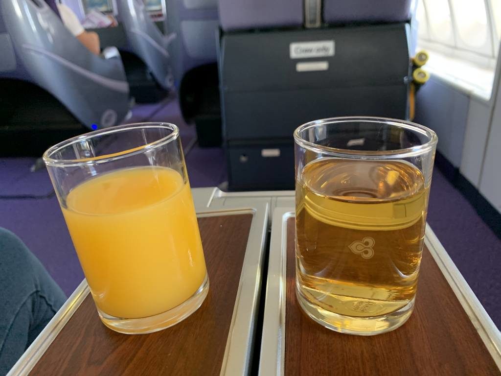 Während sich die Kabine füllte, verteilte die Crew eine erste Runde an pre-departure-Drinks. Auf dem Tablett standen Apfelsaft und Orangensaft zur Auswahl. Mehr Getränke-Auswahl gab es nicht. Dafür wurde allerdings noch ein feuchtes Tuch gereicht.