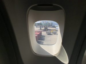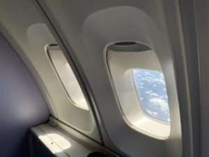 Eigentlich mit Sitz in der Notausgang-Reihe gebucht, wurden wir kurz vor dem Start noch mal umgesetzt.