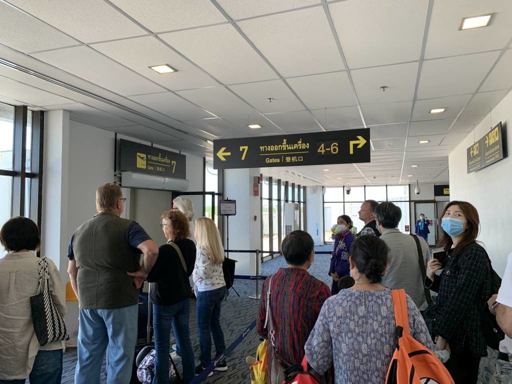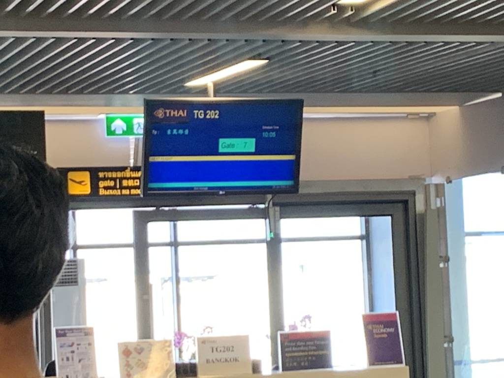 Nachdem wir zunächst etwas Zeit in der provisorischen Thai Airways Domestic Lounge und dann in der Coral Beach Lounge verbracht hatten, begaben wir uns zum Gate 7. Zum Glück lag das Gate direkt in der Nähe der Lounge. Dort bildete sich bereits brav eine lange Schlange für Economy Class und eine nur etwas weniger lange Schlange für Business Class und Status-Gäste. Das Gate und die dort wartende Menschengruppe schien viel zu klein für solch ein großes Flugzeug.