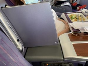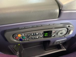 Dementsprechend lassen sich die Sitze in der Boeing 747 auch nicht in ein völlig flaches Bett verwandeln. Stattdessen handelt es sich eher um die so genannte Rutsche, in der man angewinkelt schläft. Der Sitz lässt sich durch eine Steuerungseinheit in der Armlehne verstellen. Da wir in der ersten Reihe saßen, befanden sich Fernseher und Tisch ebenfalls in der Armlehne integriert.