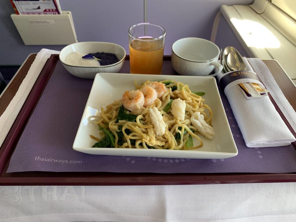 Trotz der Flugzeit von nur einer Stunde und 30 Minuten erwarteten wir in der Business Class ein vollwertiges Essen. Das wurde dann auch inmitten des Fluges am Sitz serviert. Schön ordentlich auf einem Plastiktablett, aber mit Porzellan und Metallbesteck. Unbegleitet von einer Speisekarte interpretierten wir dieses Gericht als Spaghetti mit Pak Choi, Garnelen und Tintenfisch durchmixt mit Rührei. Ich gabelte die drei Garnelen auf und versuchte mich aus Höflichkeit an den Spaghetti. Leider kam ziemlich zeitnah die Sorge auf, diese Leckerei wieder rückwärts auf der Lavatory zu essen, so dass ich es dabei beließ. Nicht weil ich Probleme damit habe, mich zu übergeben, sondern eher weil ich wusste, dass ein vorheriger Gast die Toilette etwas unkonventionell genutzt hatte.
