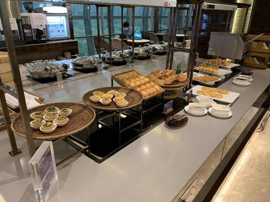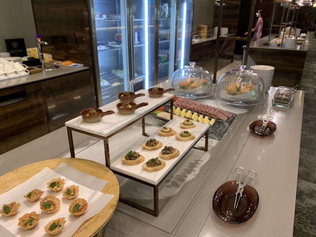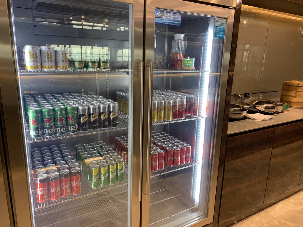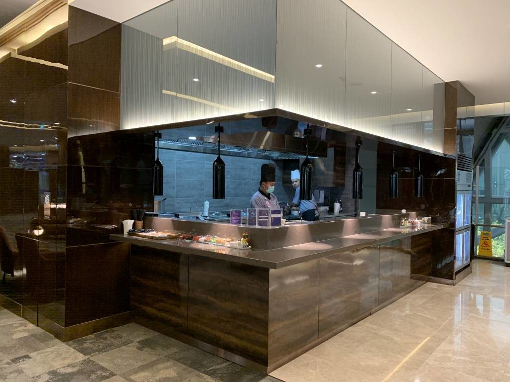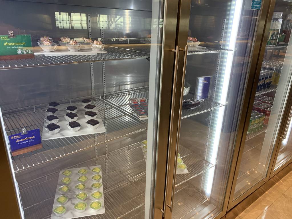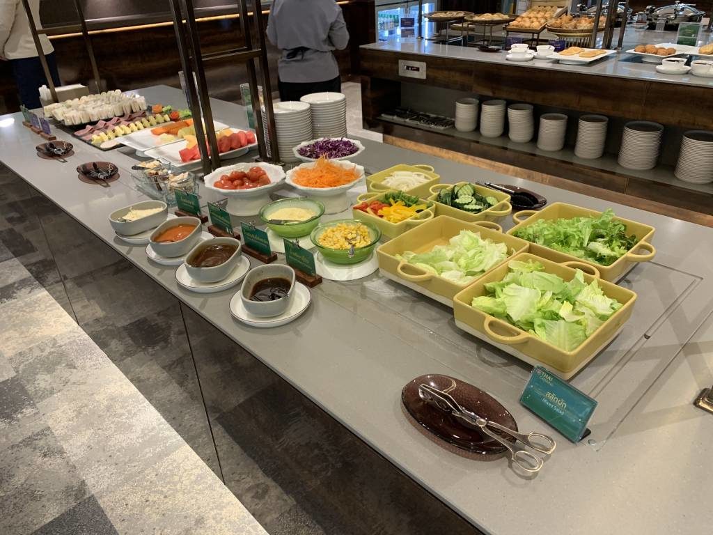 Dort steht ergänzend eine Live-Cooking-Station und ein umfangreiches Salat-Büffet zur Verfügung. Alle anderen Standards aus dem anderen Teil der Lounge gab es natürlich auch hier. Plus weitere warme Gerichte. Und großartig selbst zum Frühstück: Kokosnuss und Thai Tea Eiscreme.
