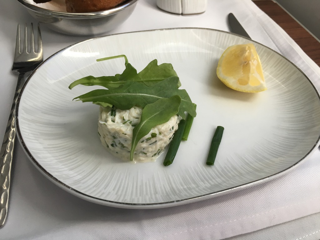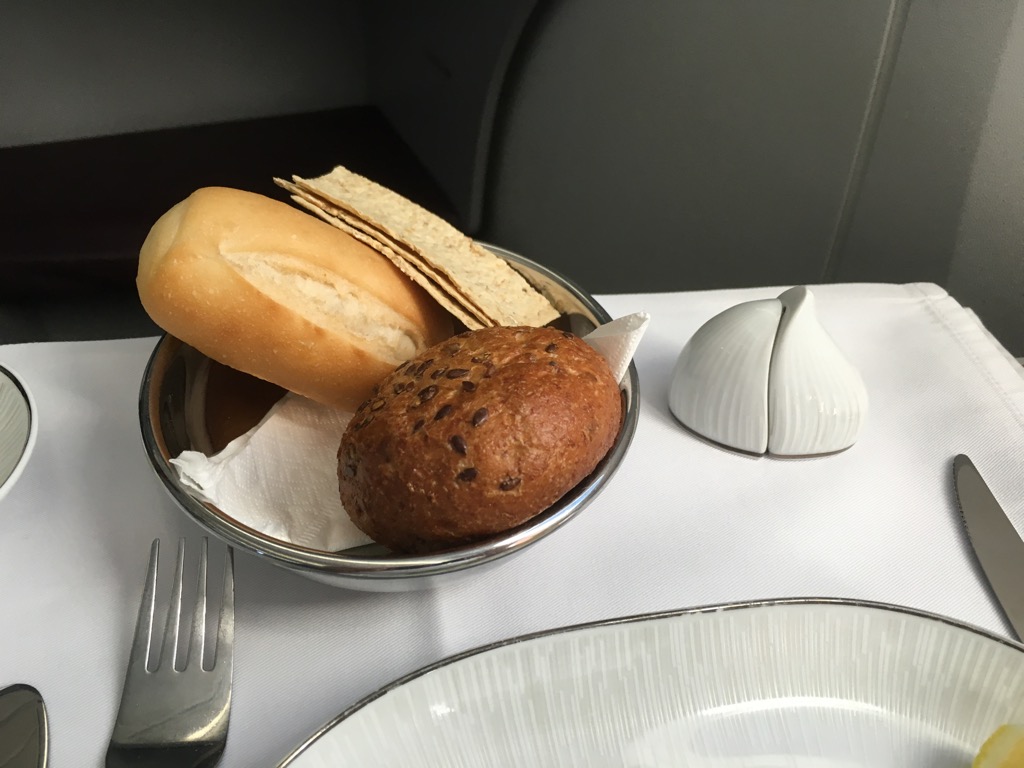 Ich habe mich für das westliche Menü entscheiden. Die Vorspeise wurde zusammen mit einem Brotkorb auf einem Tablett serviert. Die Aufdeckung in der Thai Business Class finde ich übrigens wirklich schön, allerdings fand ich es schade, dass alles auf einem Tablet serviert wurde und der Tisch nicht eingedeckt wurde.