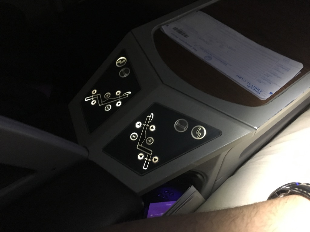 In der Armlehne befindet sich neben dem Cocktailtisch auch die Bedieneinheit für die elektronische Sitzverstellung. Zwischen den Sitzen befindet sich auch ein kleiner, nicht verstellbarer Dividier. Dieser ist zwar nicht groß, sorgt aber beim Liegen dafür, dass man seinen Sitznachbar nebenan nicht sieht und täuscht damit ein wenig Privatsphäre vor.