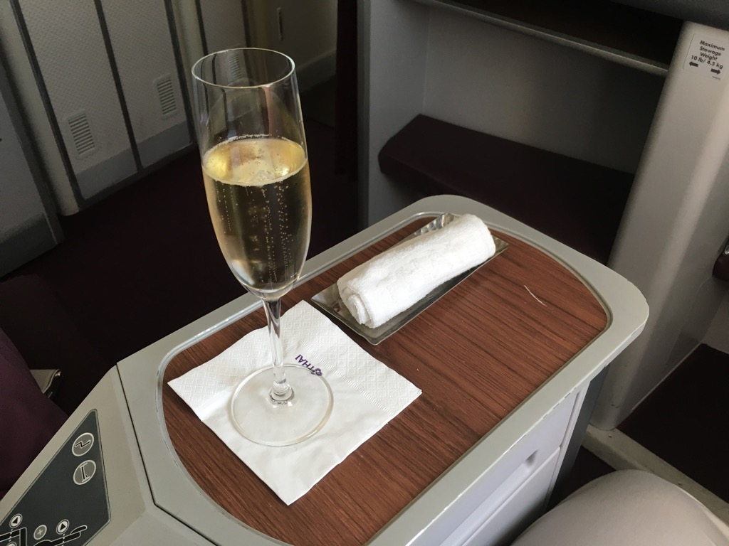 Nachdem ich meinen Platz eingenommen hatte und mein Handgepäck verstaut war, wurde ich sehr freundlich von einer der Flugbegleiterinnen begrüßt, samt Thai üblicher kleine Verbeugung und wurde nach meinen Getränkewünschen gefragt. Mein Glas Champagner wurde zusammen mit einem heißen Tuch geliefert.